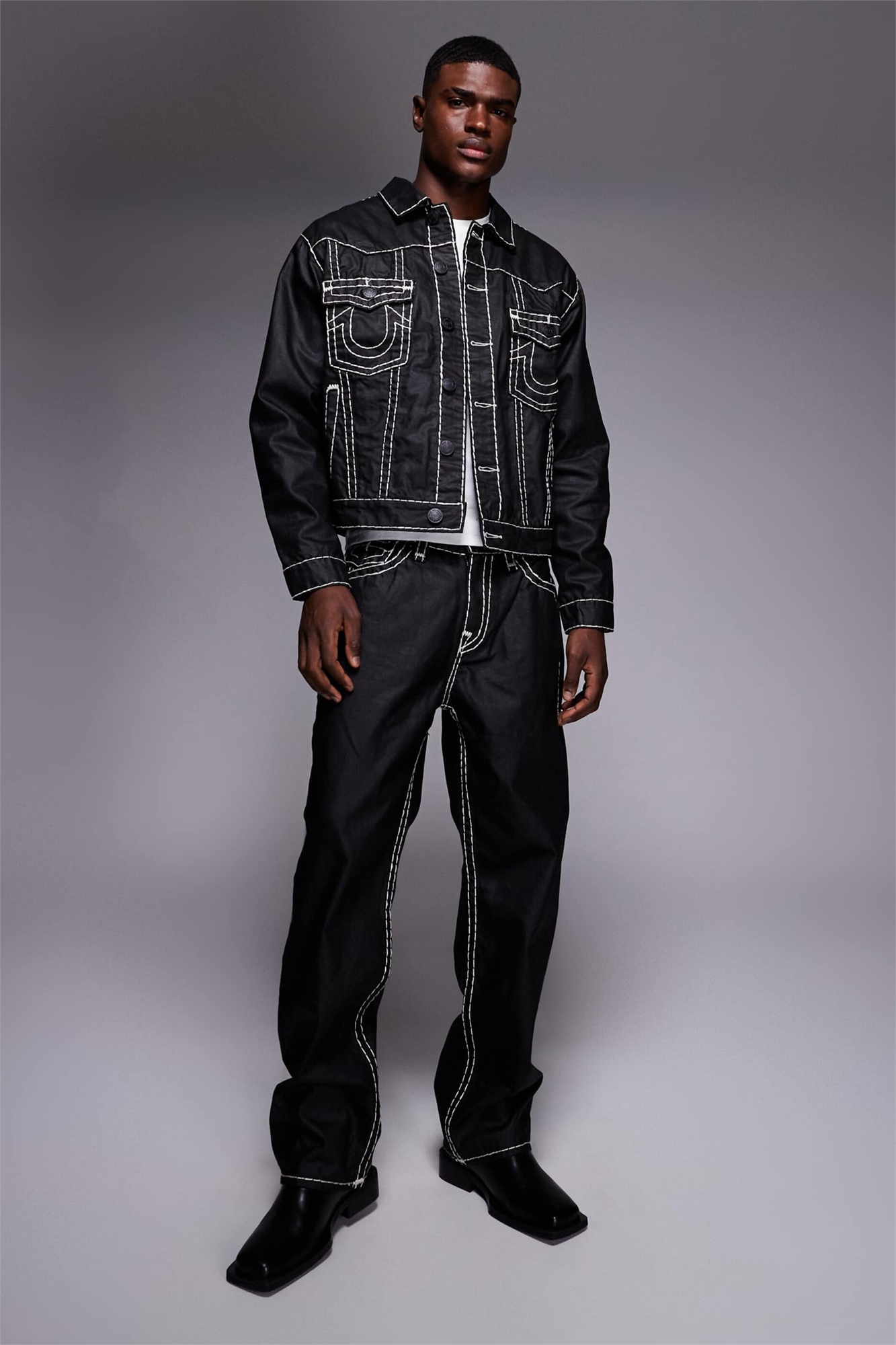 Неэластичный деним: черная стирка Основной материал: 100% хлопок.