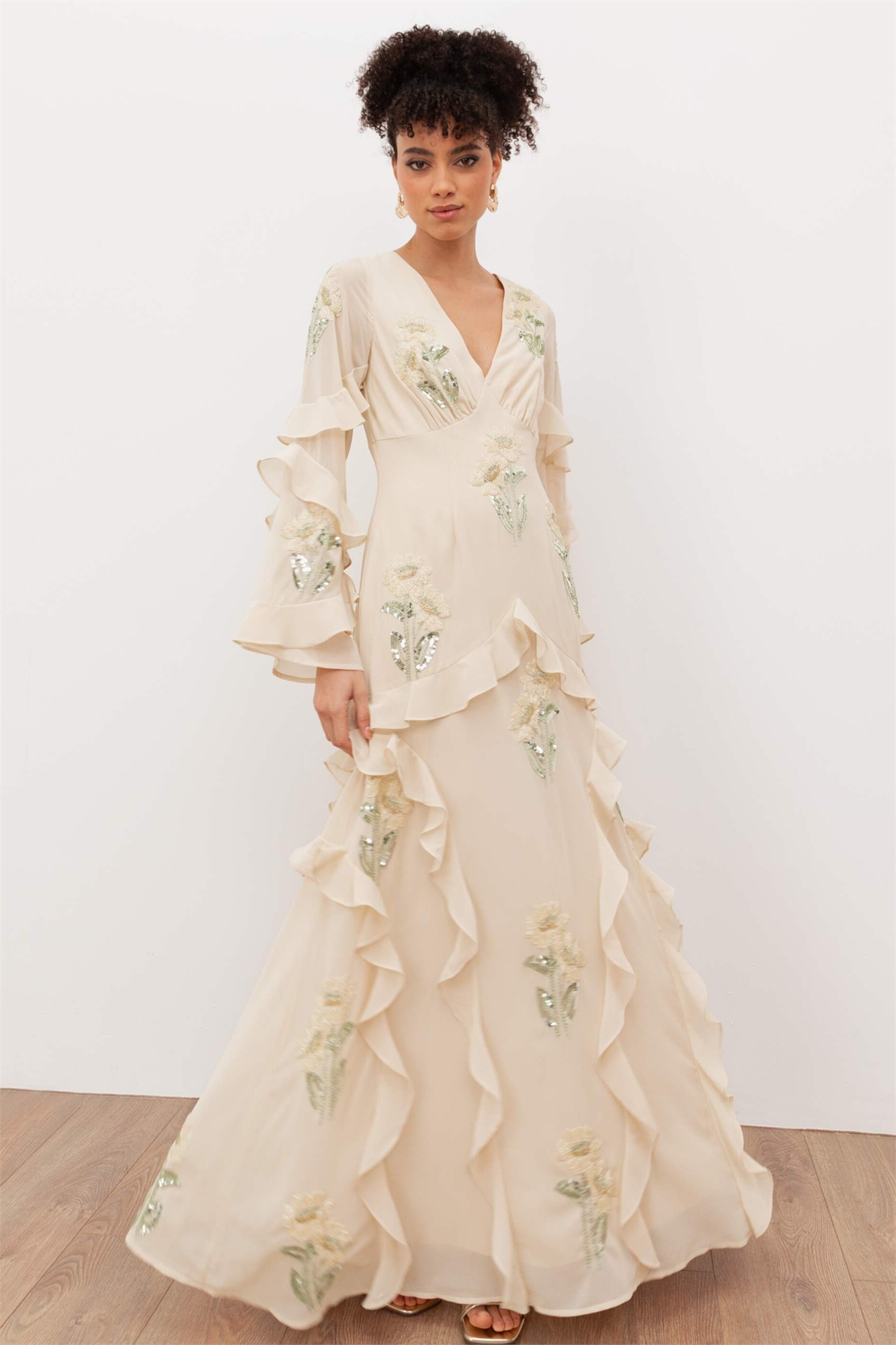 Макси-платье с длинными рукавами и оборками