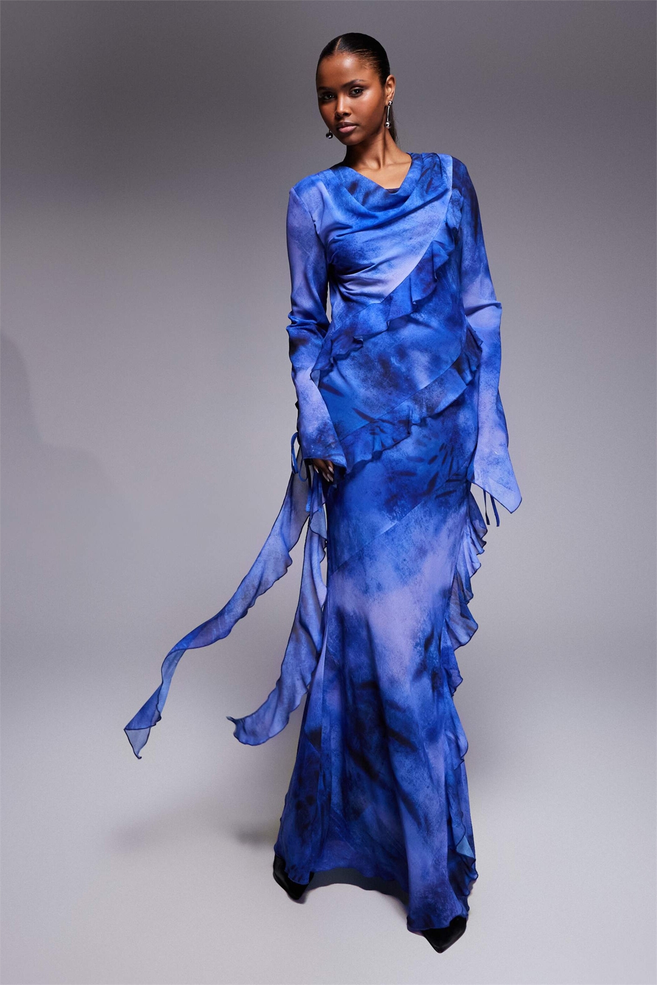 Макси-платье из шифона с высоким воротником-капюшоном и оборками