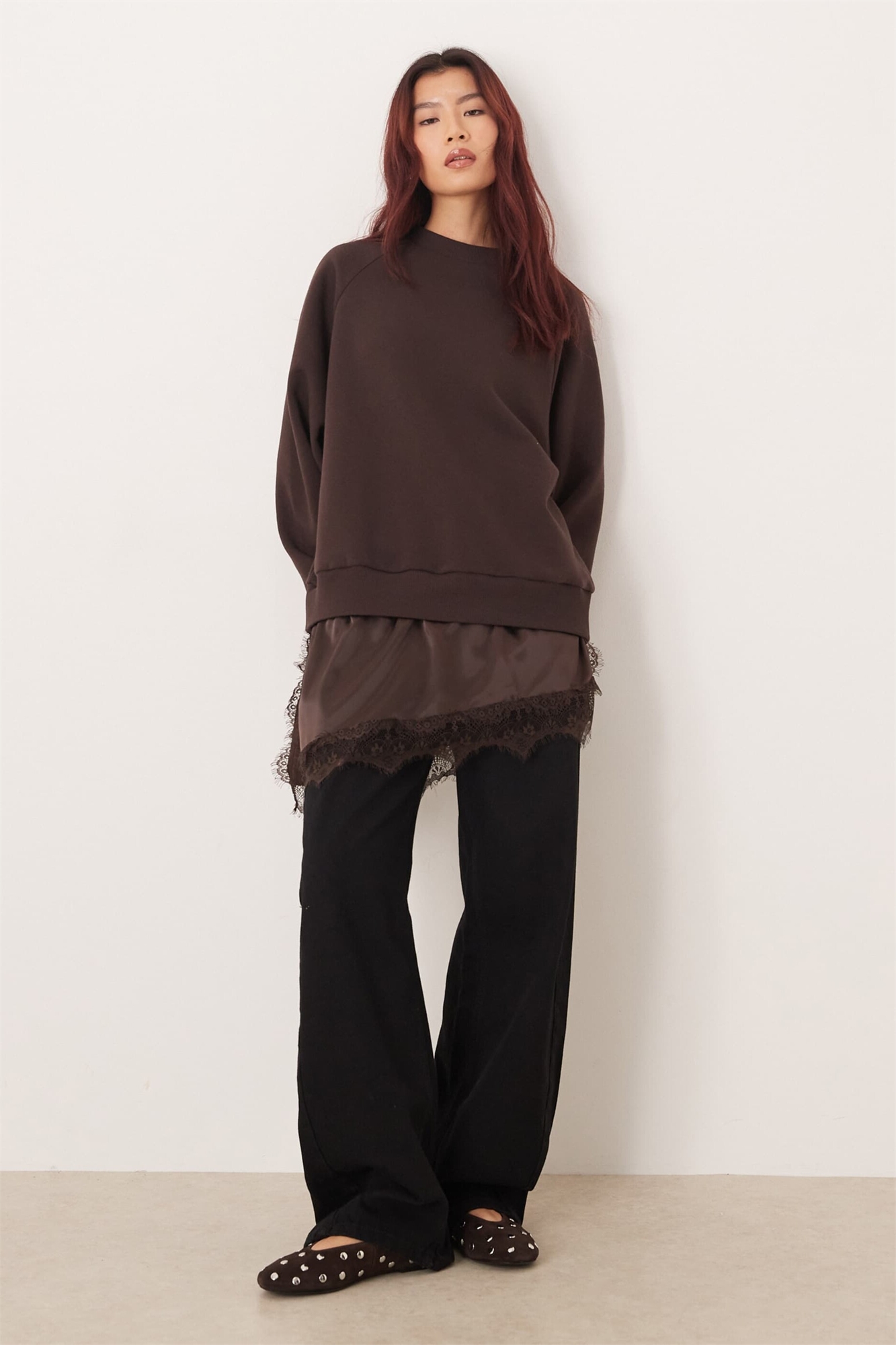 Свободная толстовка с топом-камизолкой из атласа и кружева с открытыми вставками