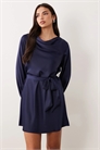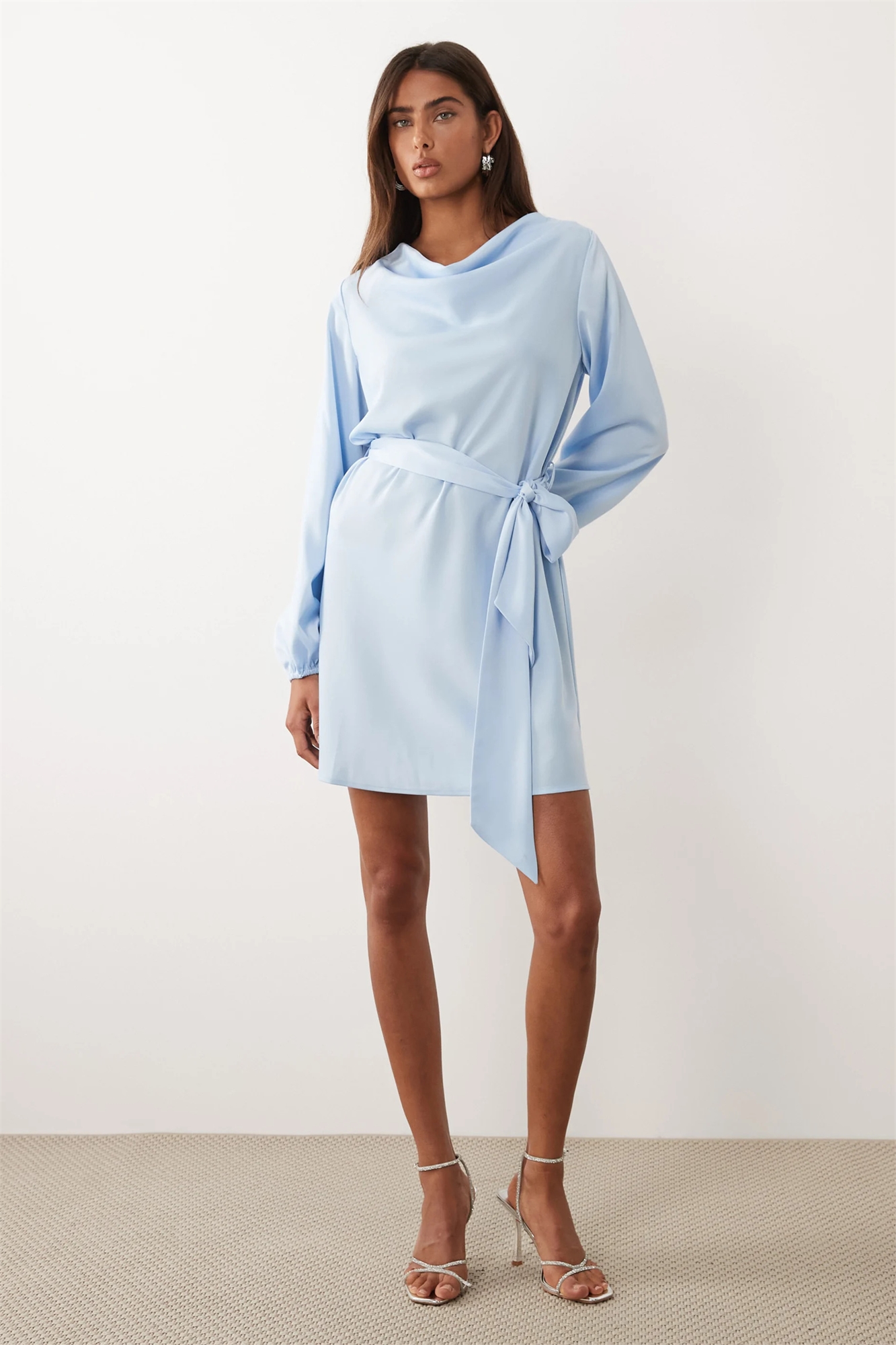 Мини-платье из атласа с высоким воротником и длинными рукавами