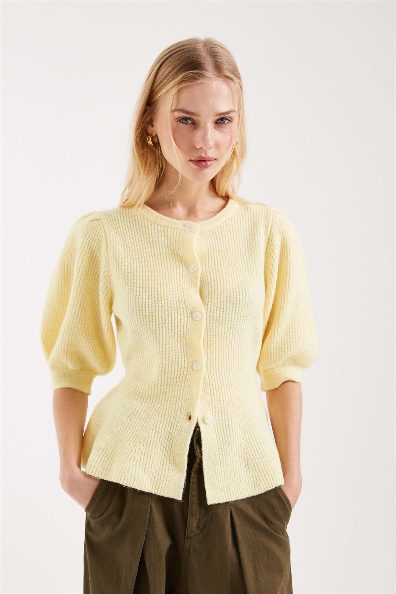 Вязаный кардиган с буфчатыми рукавами и акцентом на талии