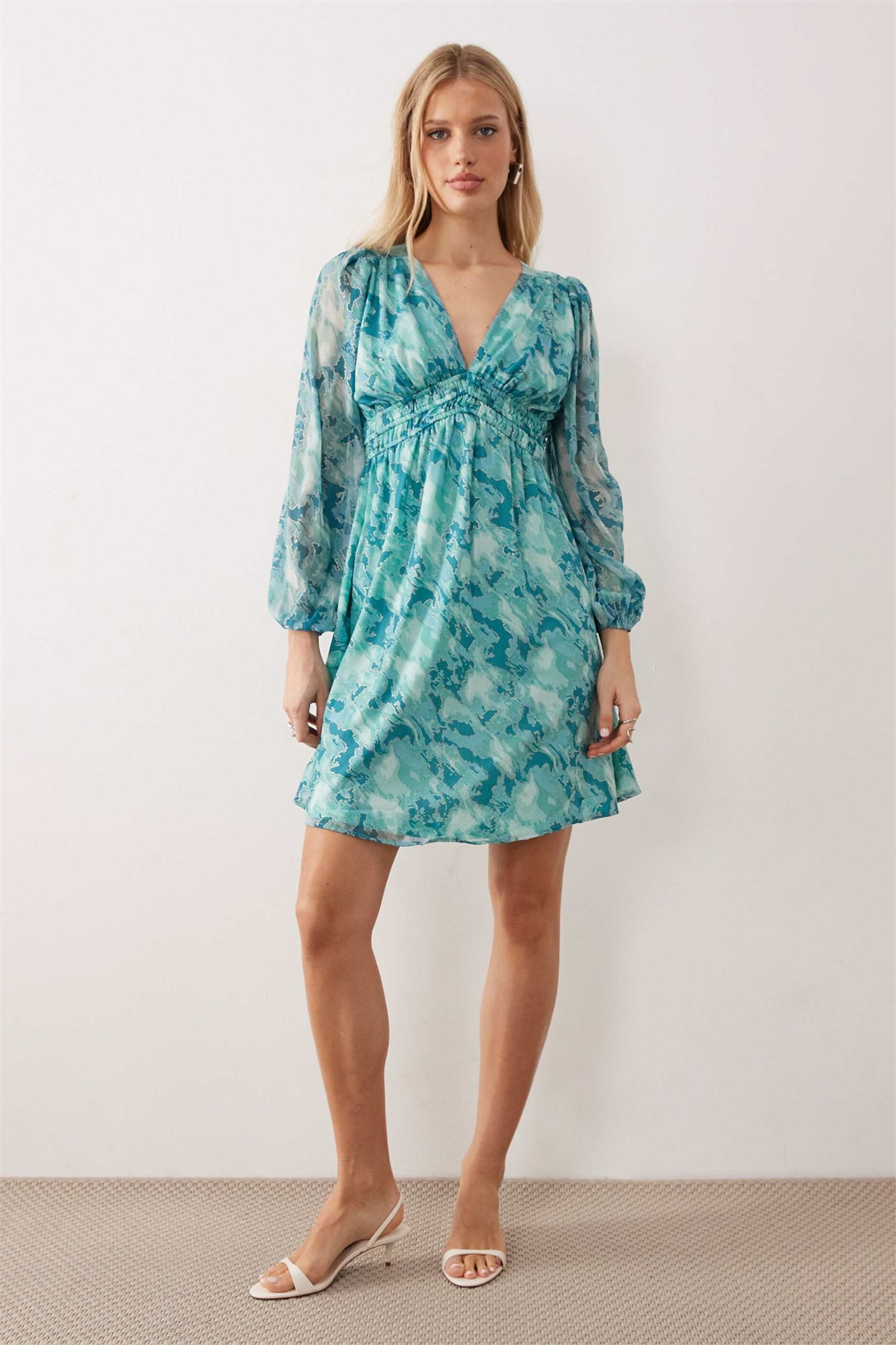 Мини-платье с длинными рукавами, сборками и линией талии «империя»