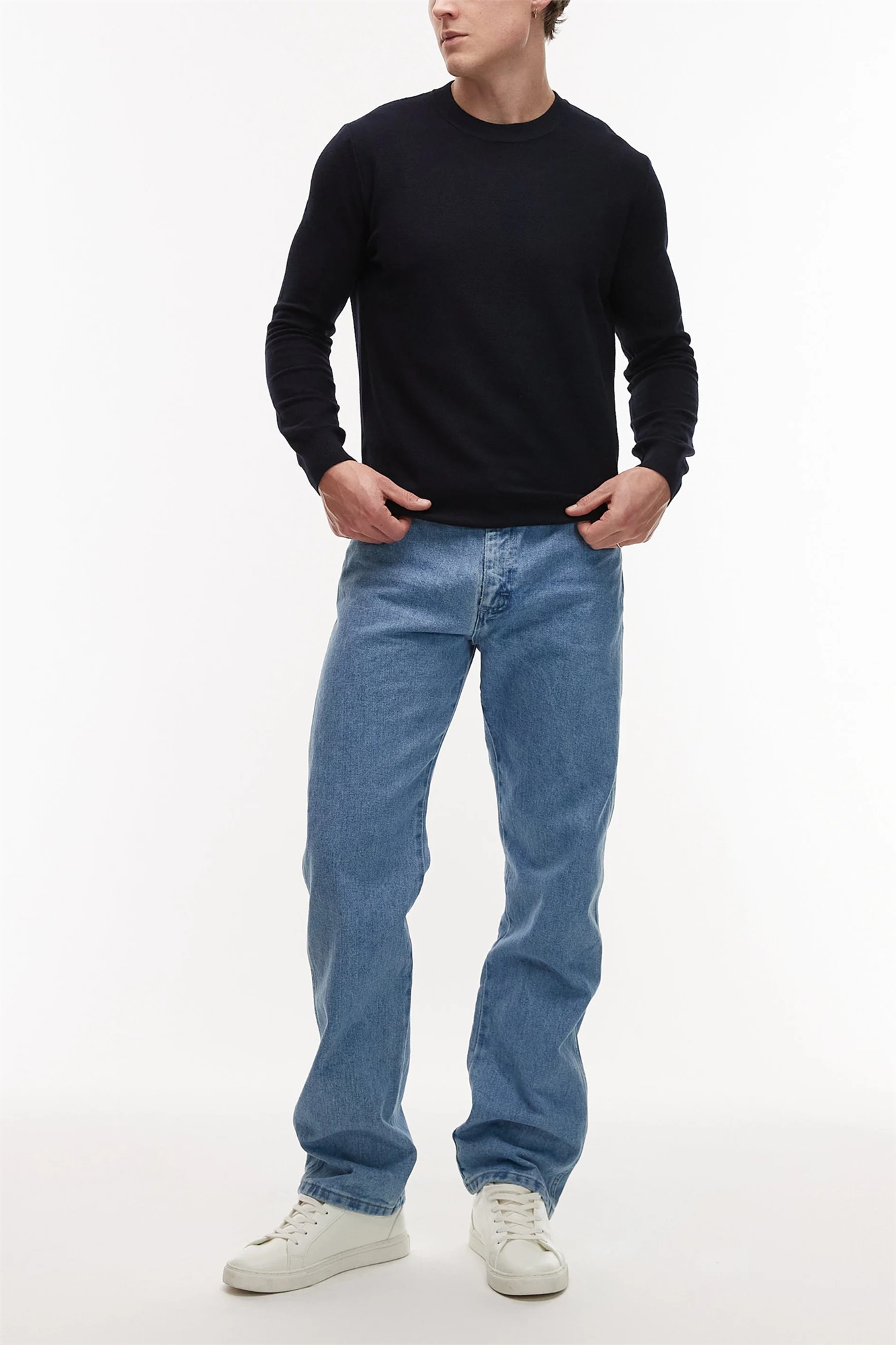 Джинсовая ткань без эластана: оттенок «средне-синий». Основной состав: 100% хлопок.