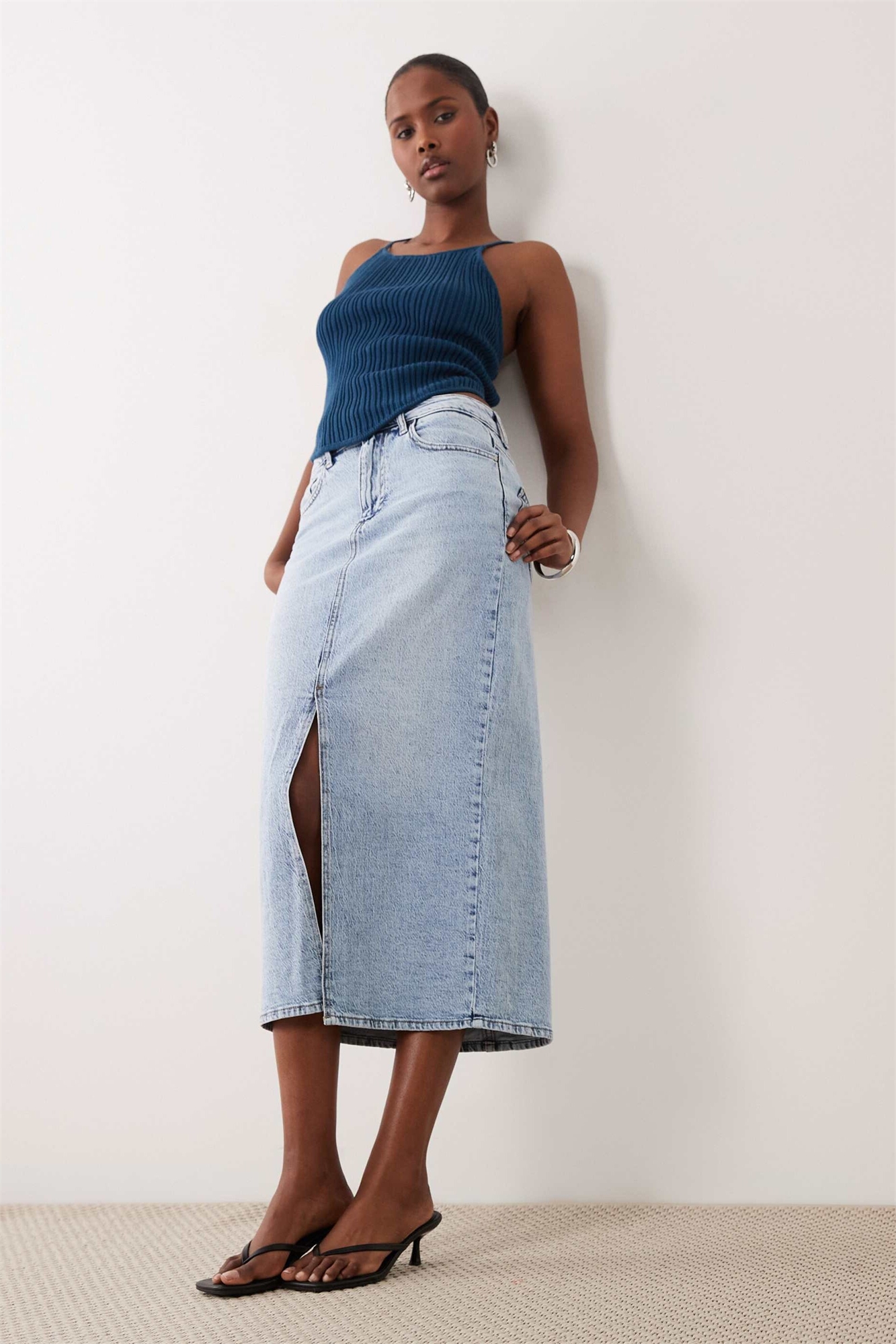Джинсовая юбка средней длины с высокой талией и разрезом спереди