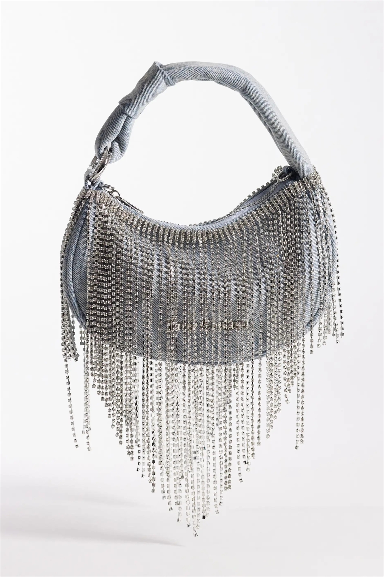 Сумка через плечо из денима с серебристой цепочкой и стразами, модель Y2K