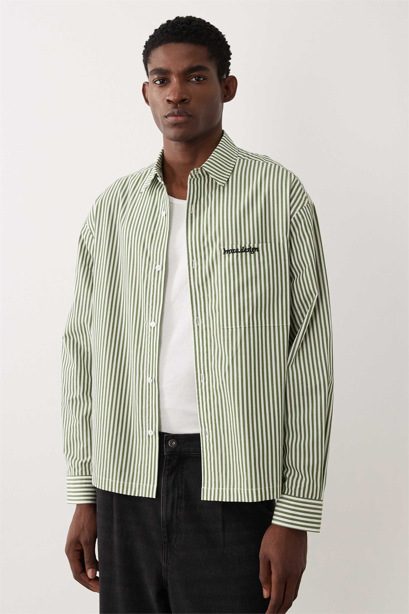 Рубашка свободного кроя в тонкую полоску с вышивкой на кармане