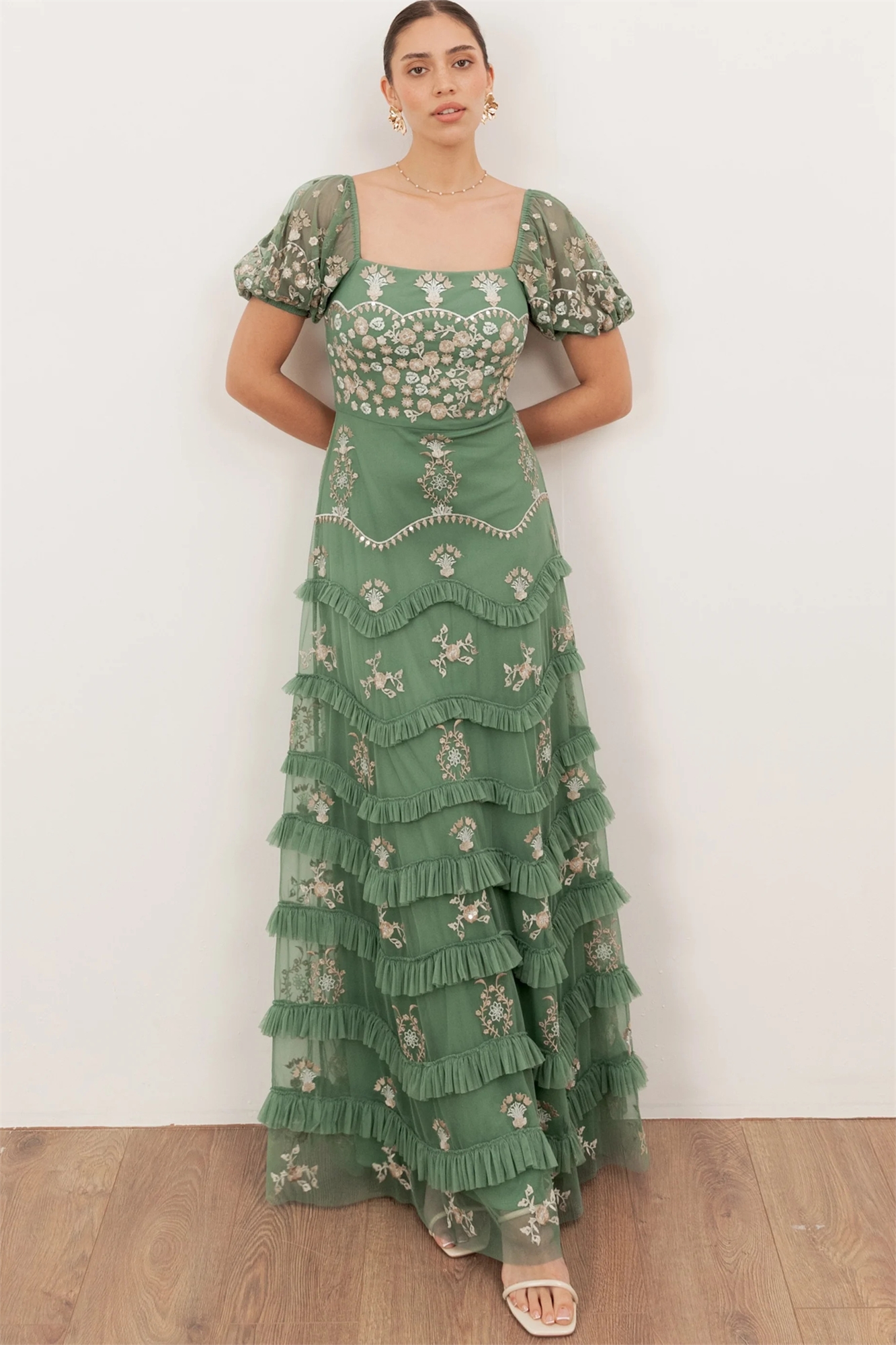 Макси-платье с квадратным вырезом и рукавами-буффами, украшенное вышивкой