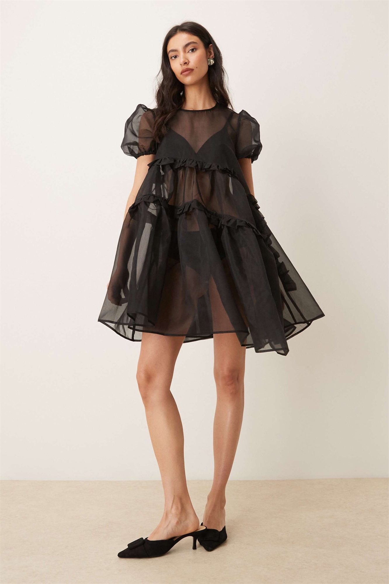 Эксклюзивное мини-платье из прозрачной органзы с буфчатыми рукавами, многослойными оборками и асимметричным подолом
