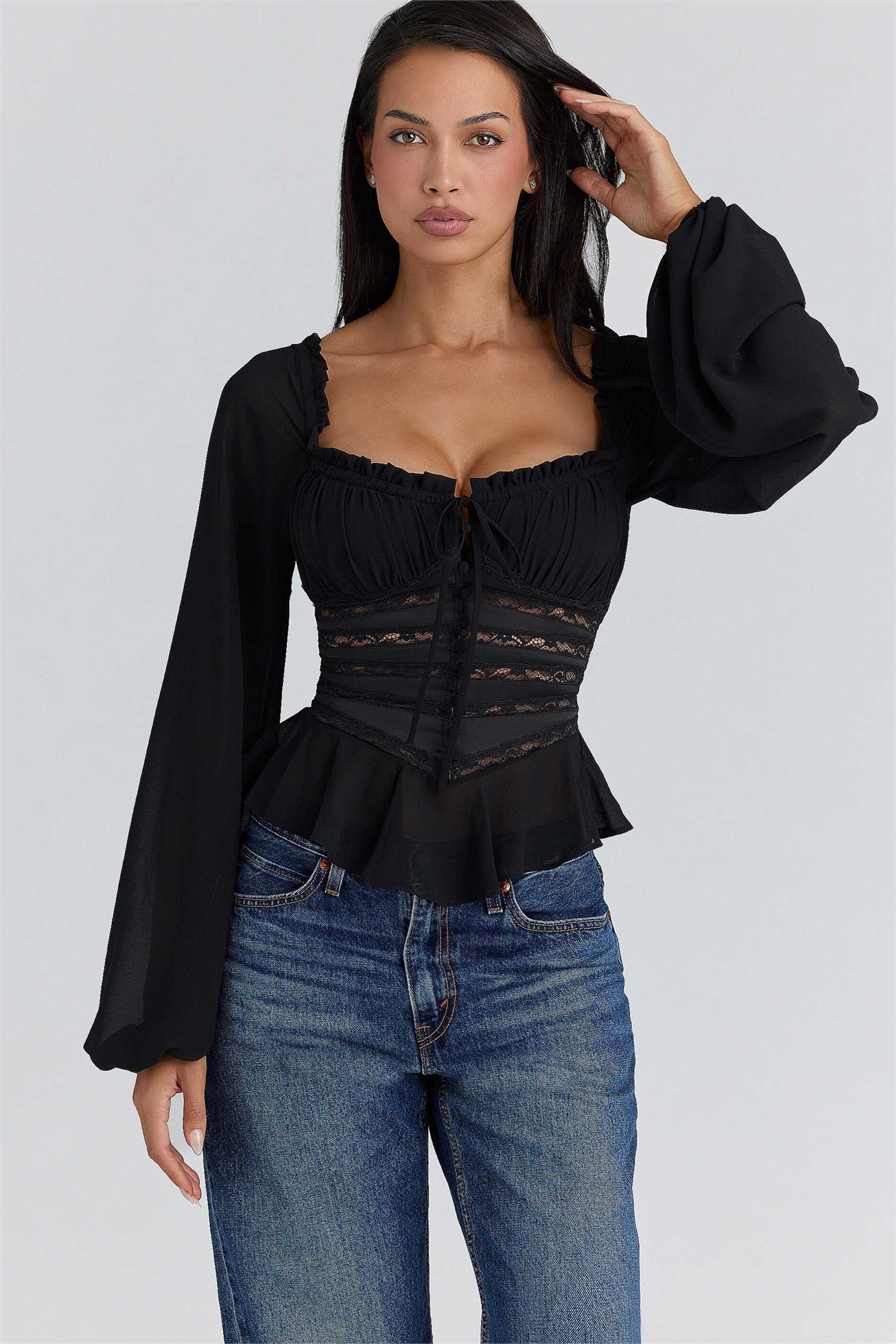 Топ Cara черного цвета с длинными рукавами из жоржета с баской