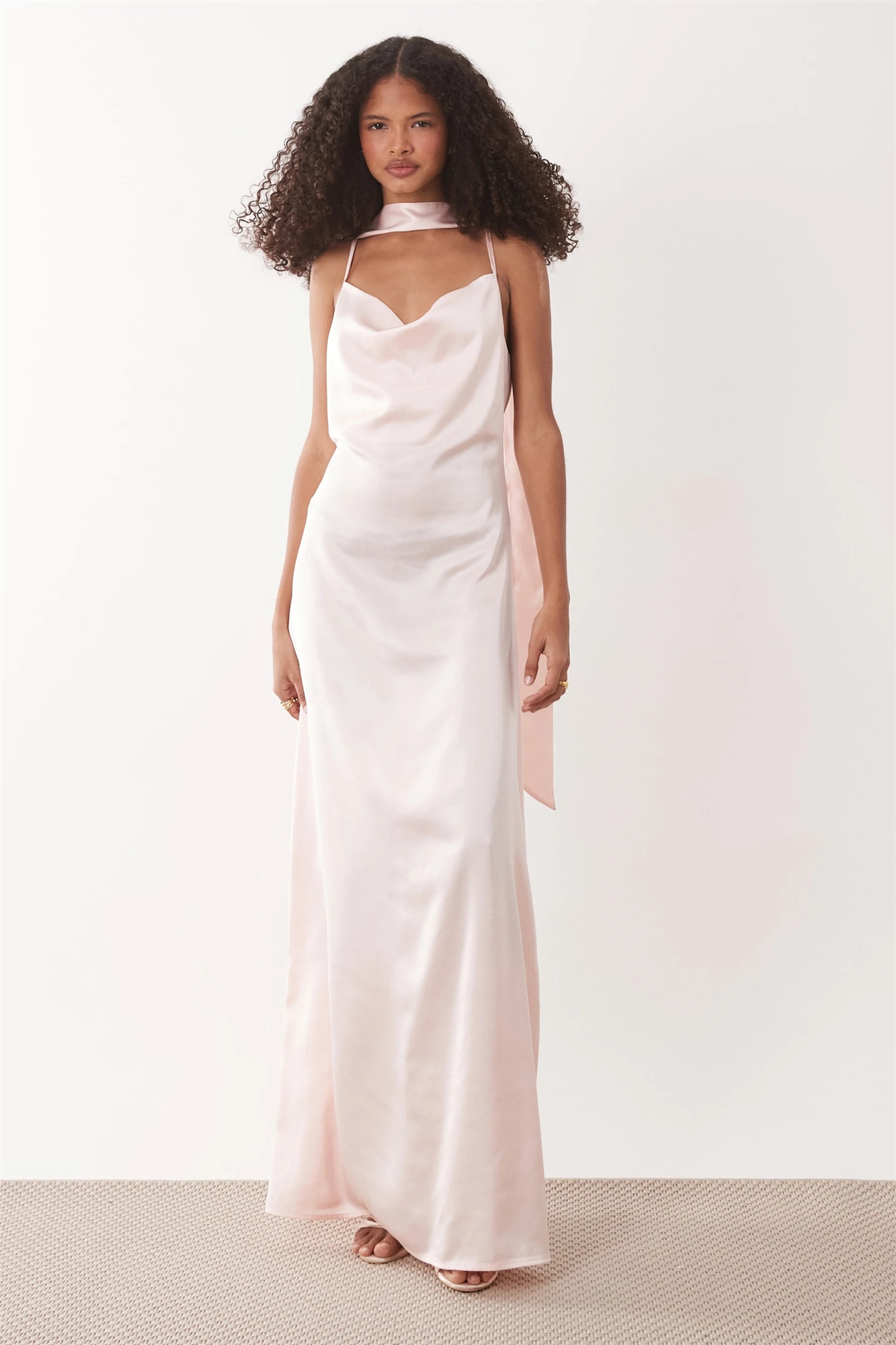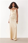 Атласное макси-платье с воротником-капюшоном, открытой спиной и шарфом