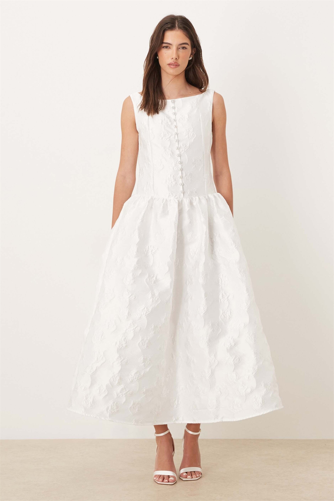 Эксклюзивное свадебное макси-платье Dream Sister Jane из жаккарда с лодочным вырезом и застежкой на жемчужные пуговицы
