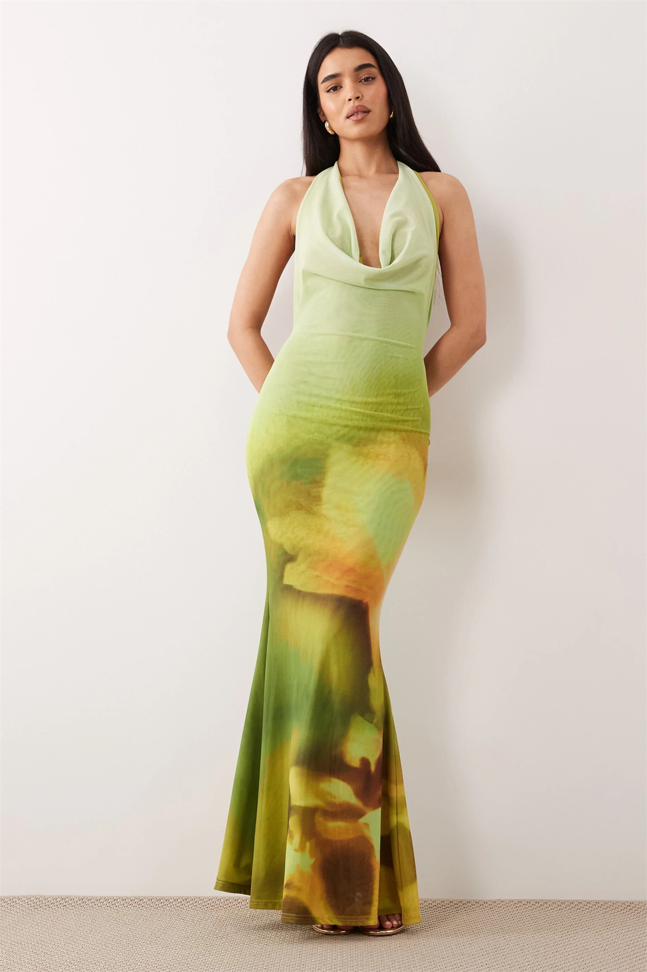 Макси-платье из сетчатой ткани с капюшоном, завязками за шеей, открытой спиной и юбкой «рыбий хвост»