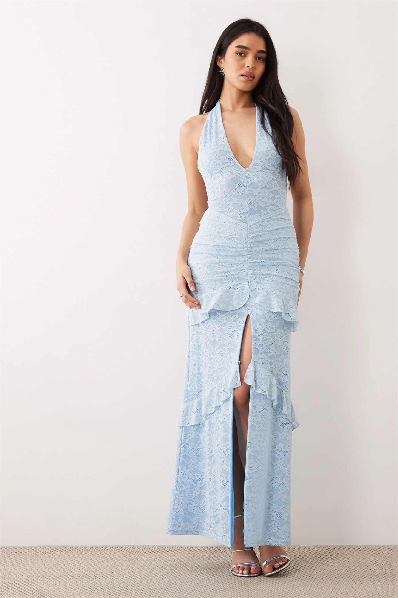 Макси-платье с кружевом, завязками за шеей, глубоким вырезом и многослойной юбкой с оборками