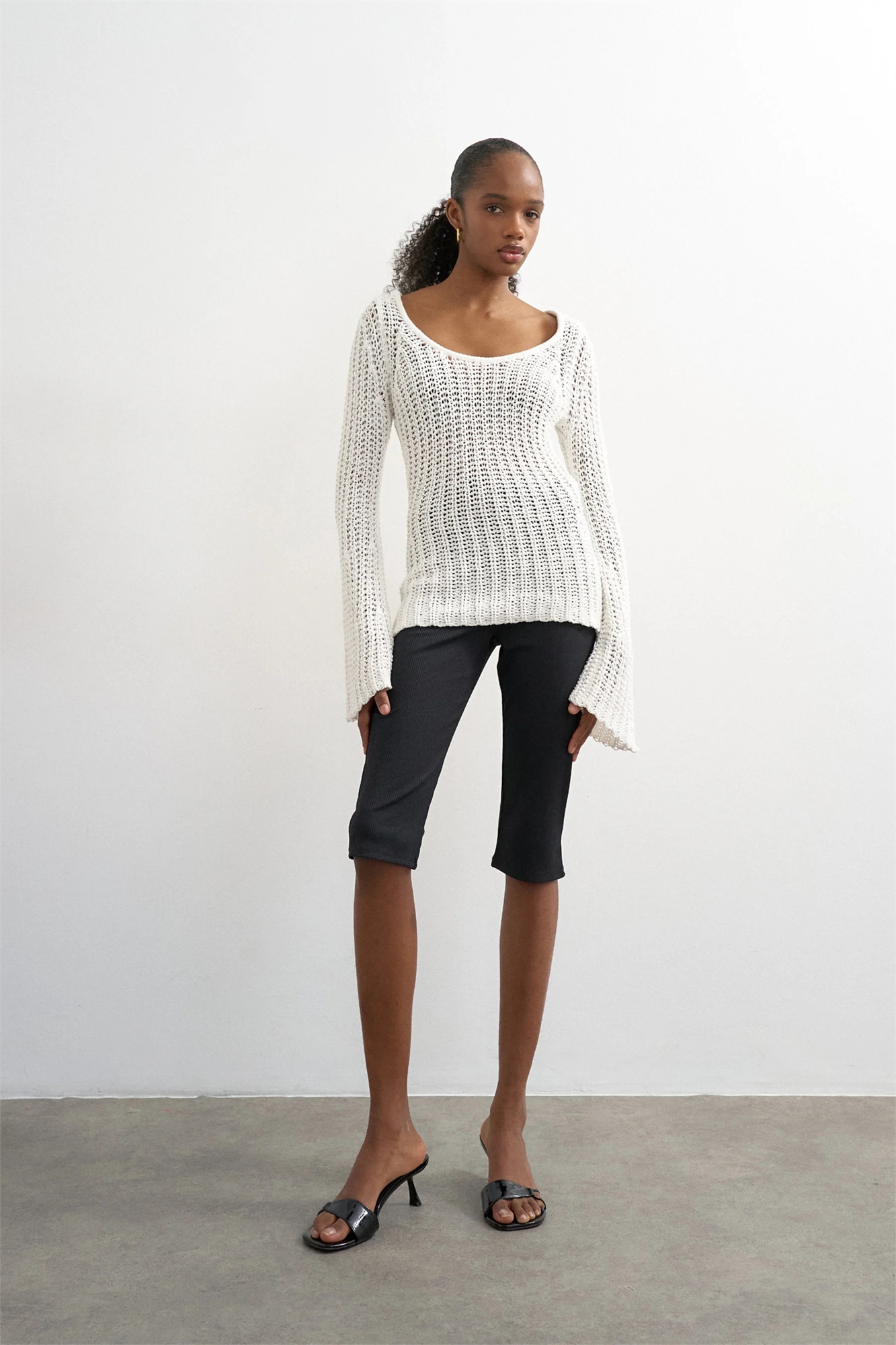 Узкие брюки-капри с расклешенными штанинами