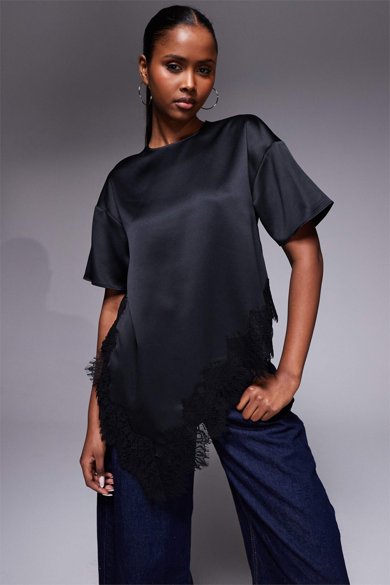 Футболка из атласа с асимметричным кружевом