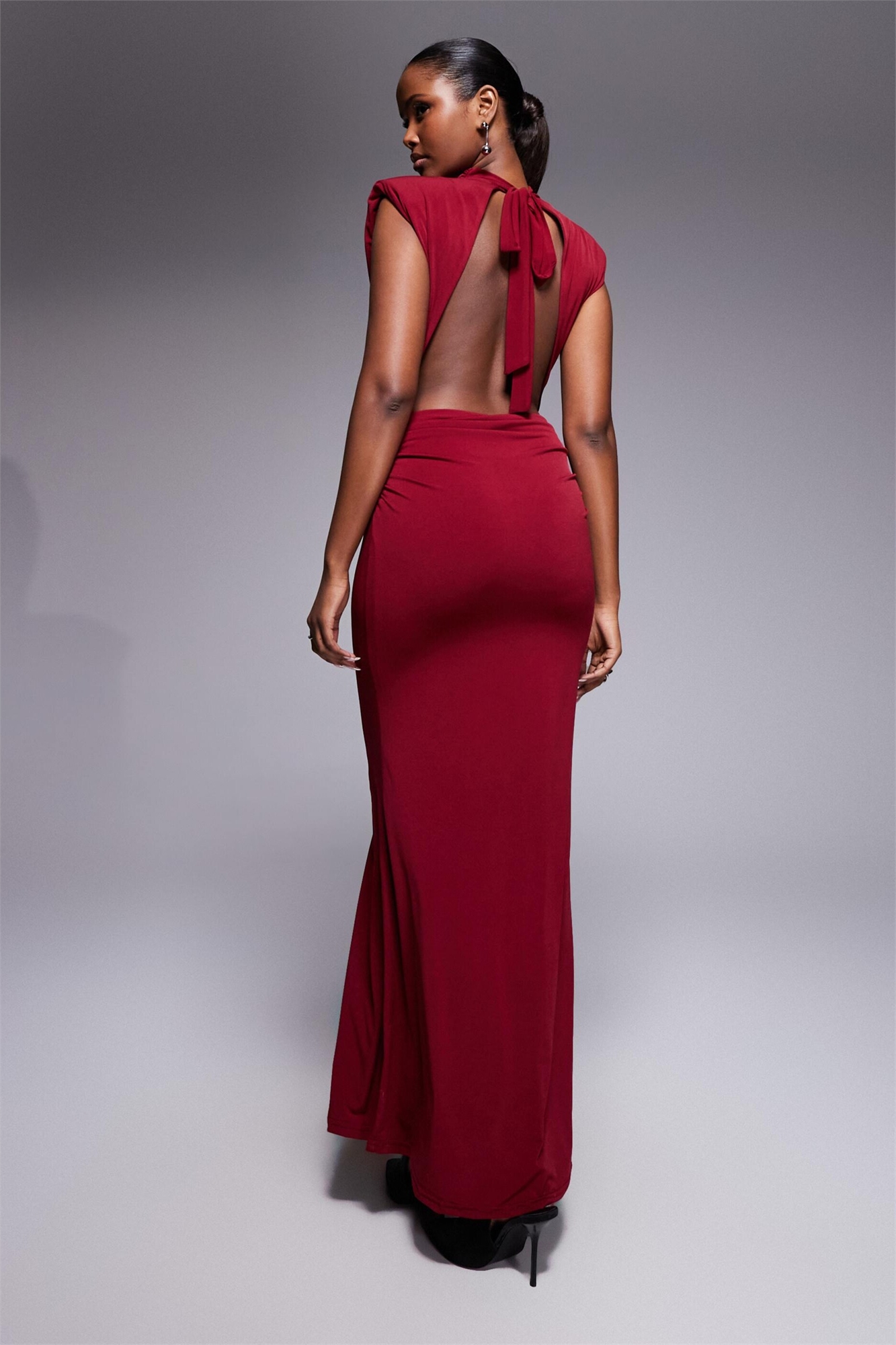 Макси-платье с высоким воротником, драпировкой, плечевыми накладками и открытой спиной