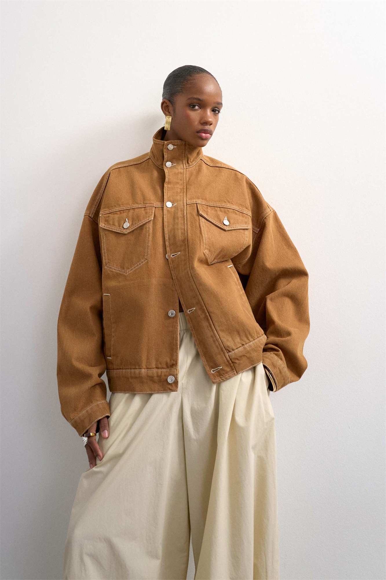 Джинсовая куртка с воротником-воронкой и эластичным подолом, табачного цвета