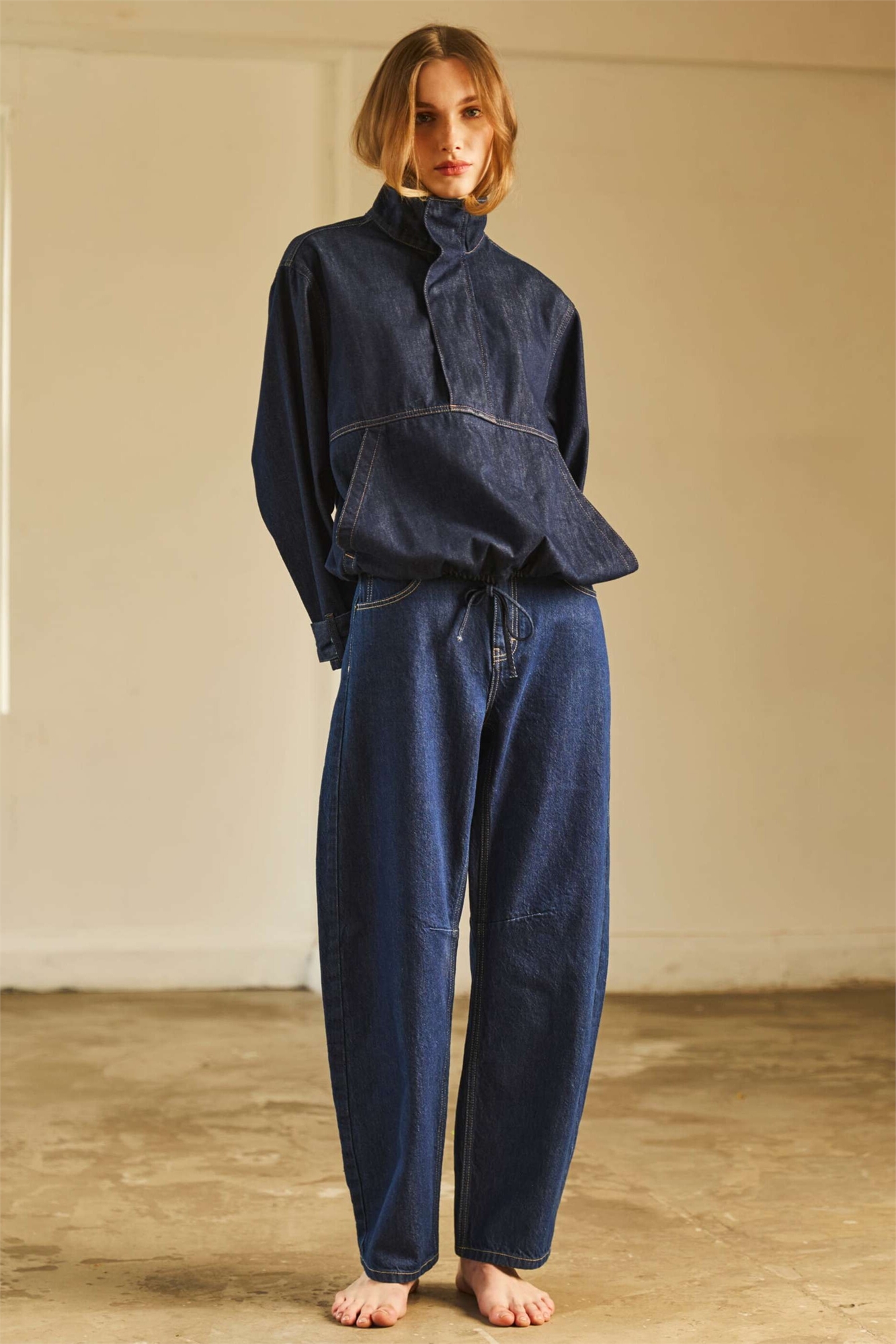 Топ из денима с волнистым подолом и воротником-воронкой