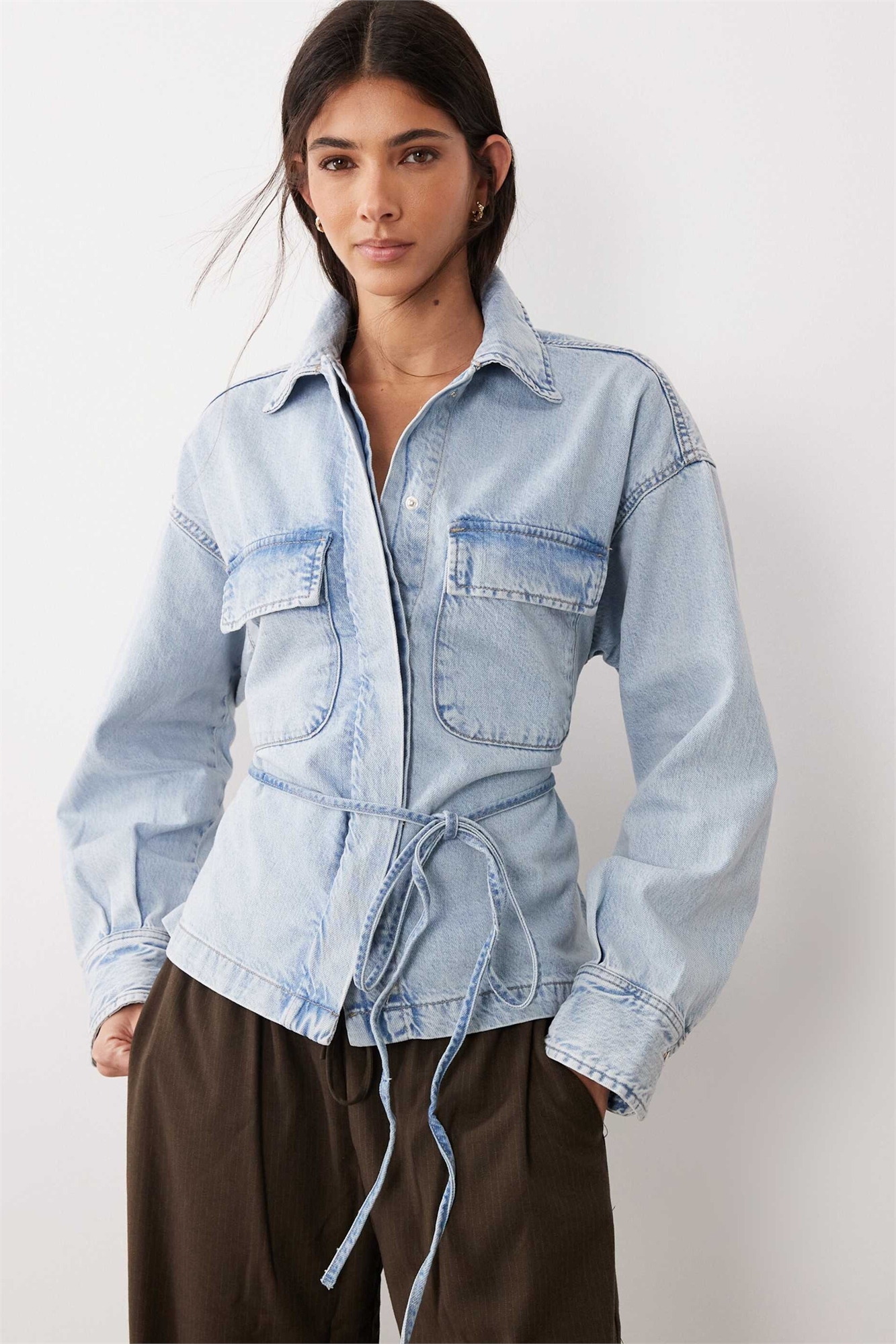 Джинсовая рубашка с завязками спереди и зауженной талией