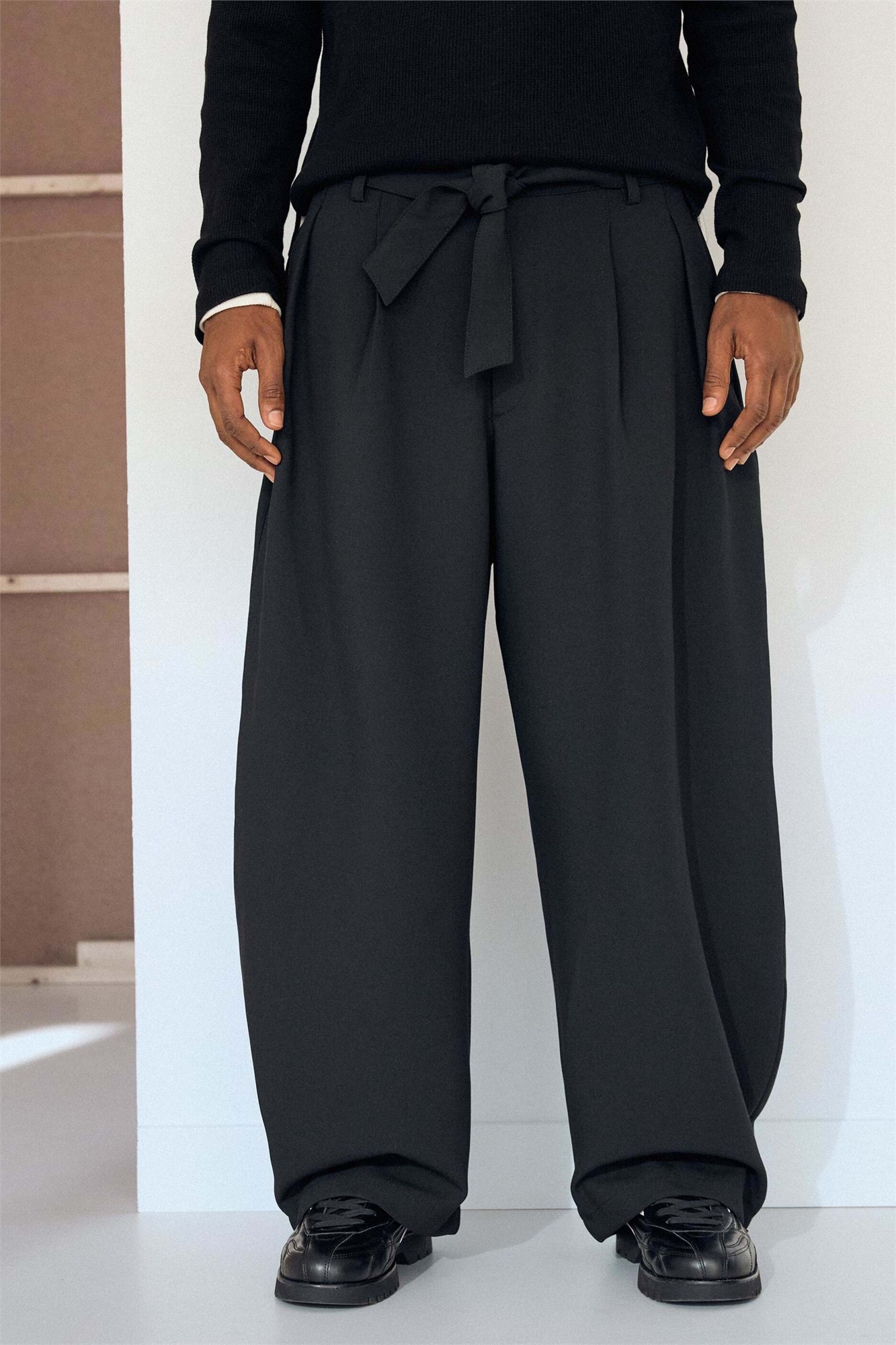 Брюки приталенного кроя с широкими штанинами и ремнем
