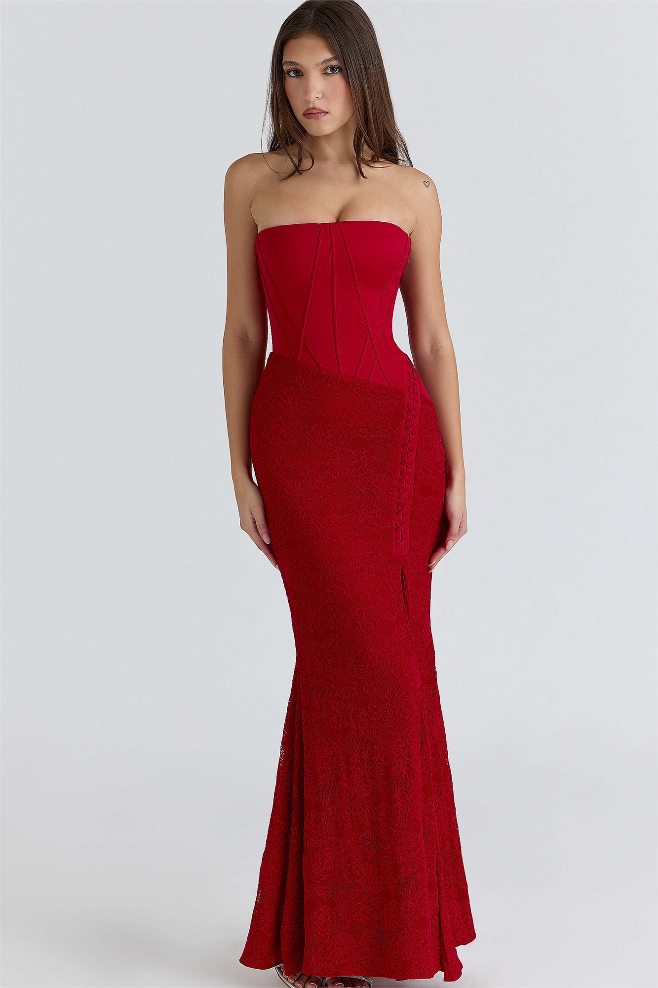 Макси-платье Валери из красного атласа с кружевом и открытыми плечами