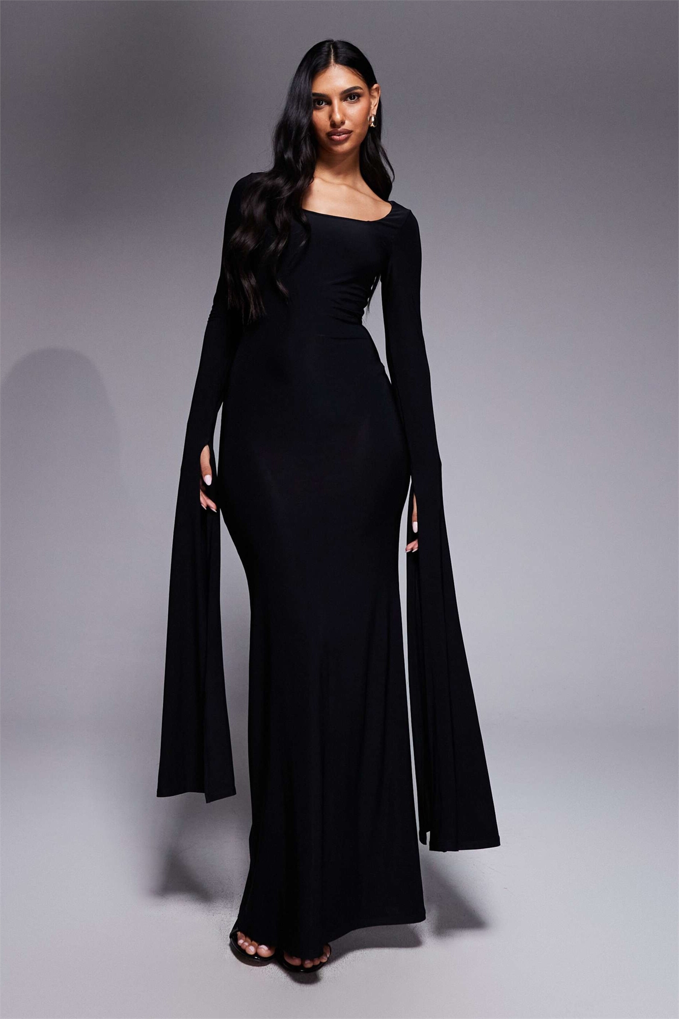 Макси-платье с вырезом «лодочка», длинными рукавами с эффектной драпировкой и длиной до пола, черного цвета