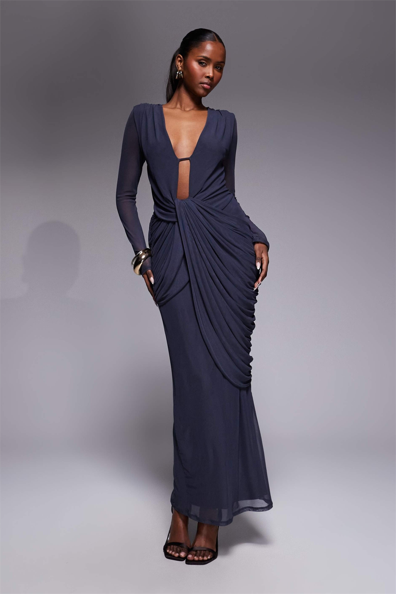 Платье-миди с глубоким вырезом, длинными рукавами и драпировкой