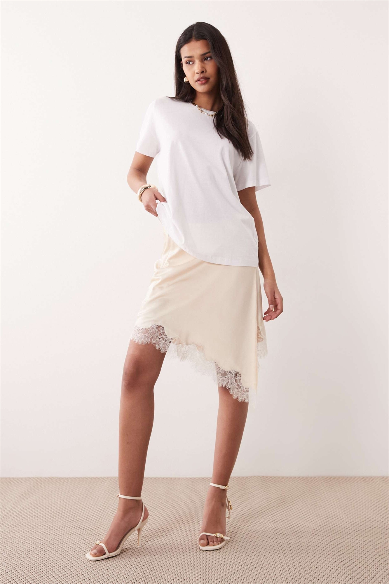 Асимметричная мини-юбка из атласа с кружевной отделкой
