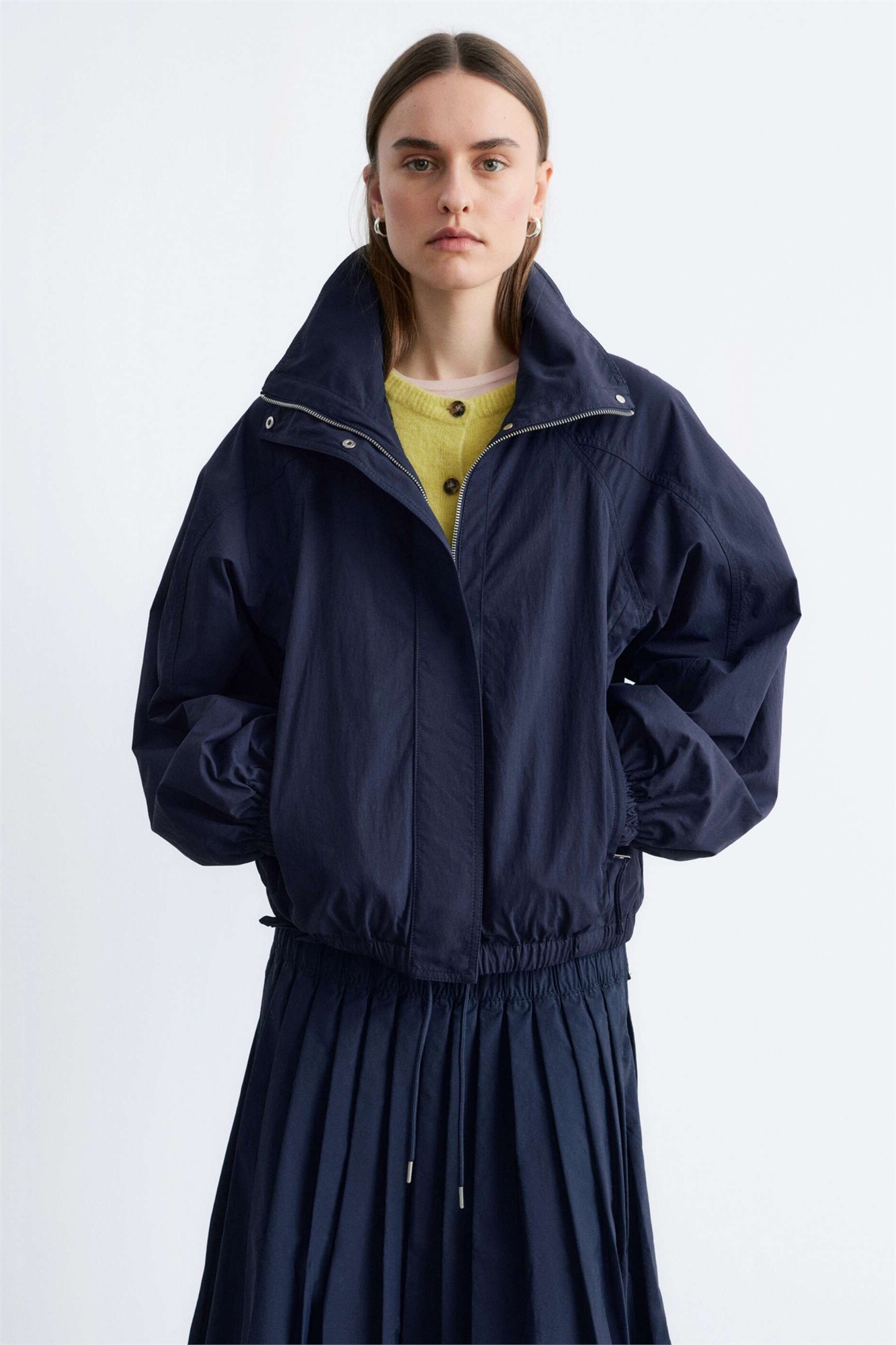 Нейлоновая короткая бомбер-куртка с заутюженной складкой на талии, темно-синего цвета