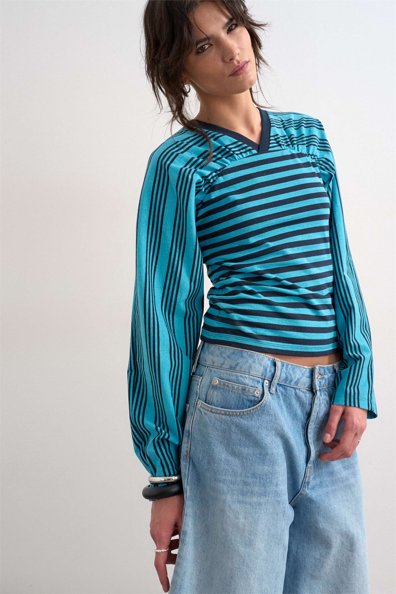 Топ с длинными рукавами и швом на плечах, синий в полоску