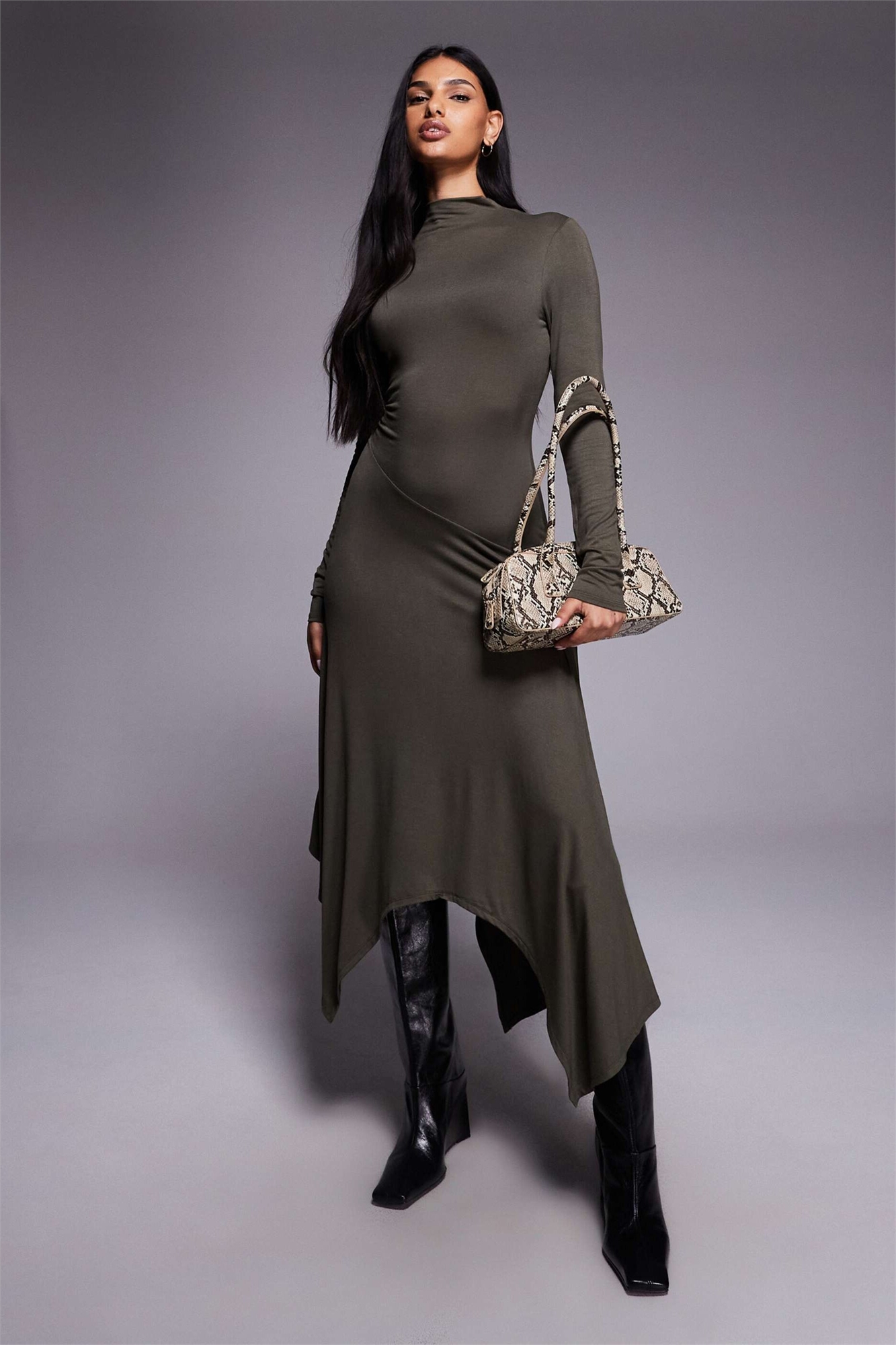 Платье средней длины с воротником-воронкой и асимметричным подолом
