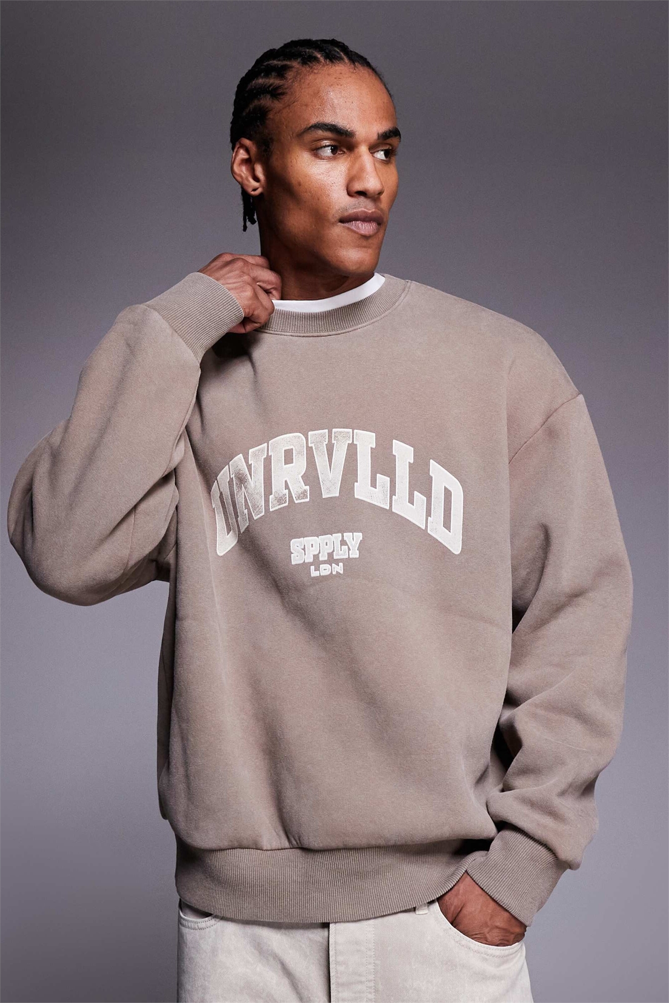 Свитшот свободного кроя с круглым вырезом и эффектом потертости, украшенный принтом