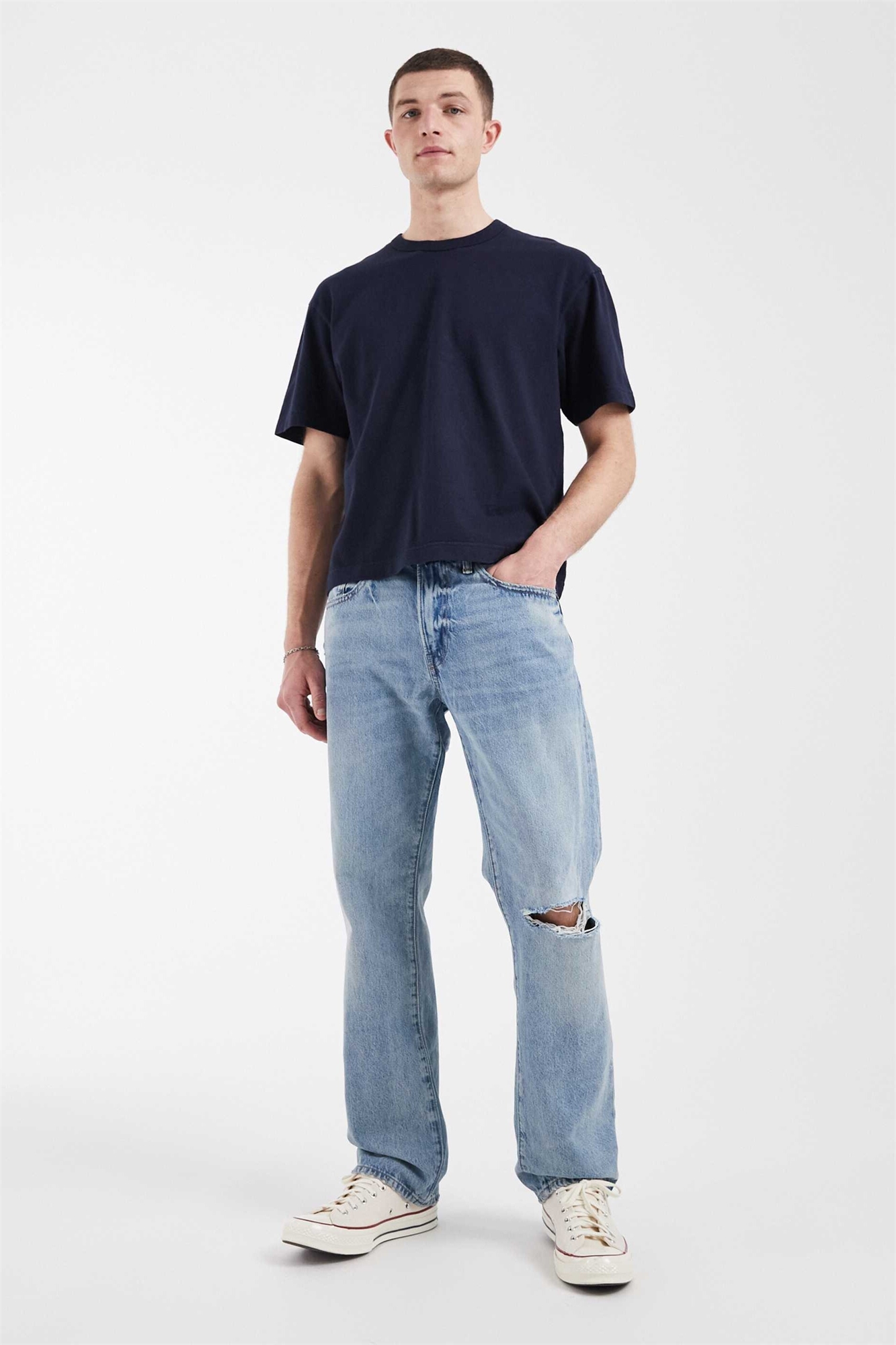 Неэластичный деним: средне-синий оттенок Основной материал: 100% хлопок.