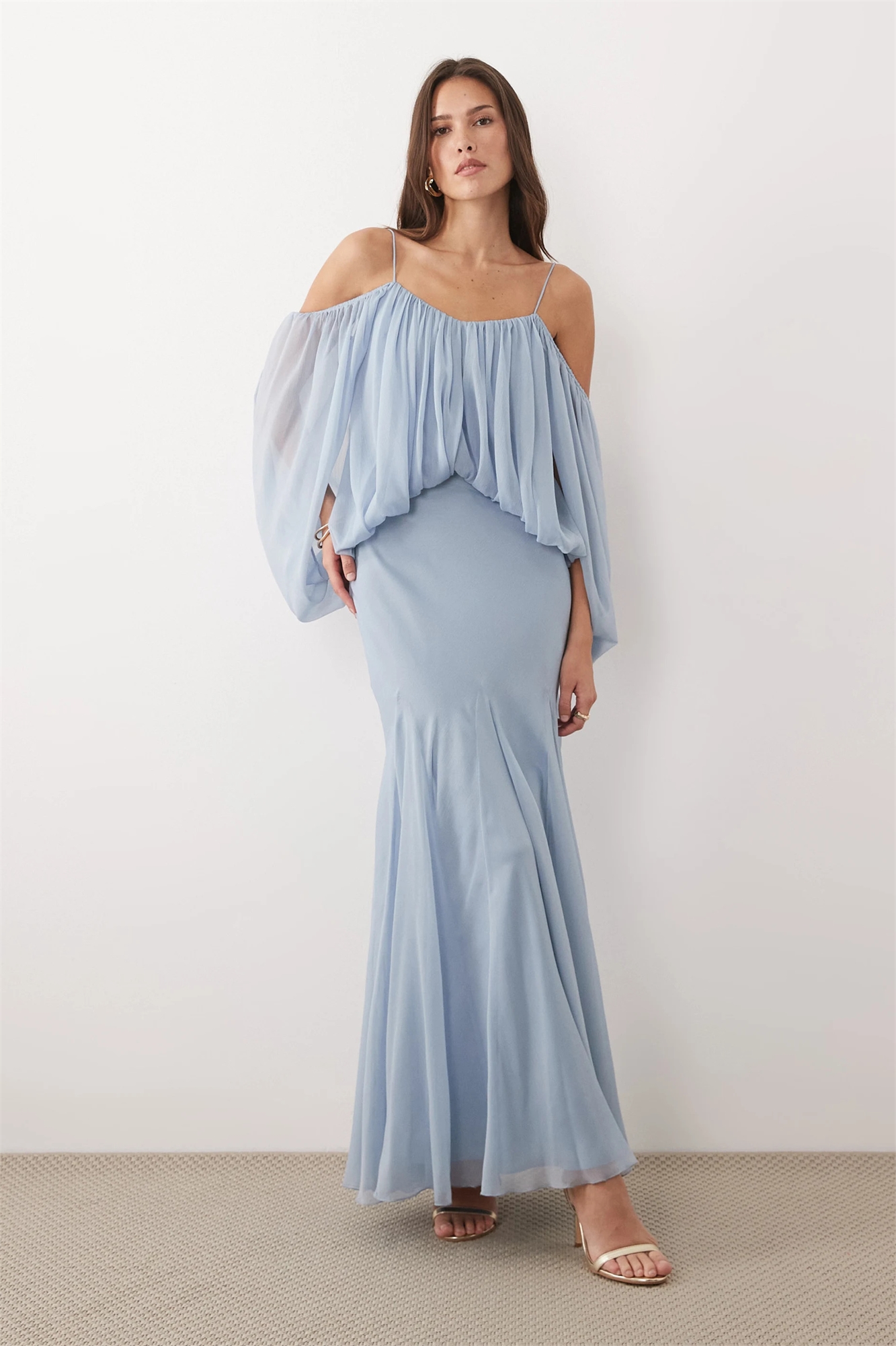 Макси-платье с лифом в стиле блузон, рукавами с разрезами и юбкой с объемными вставками