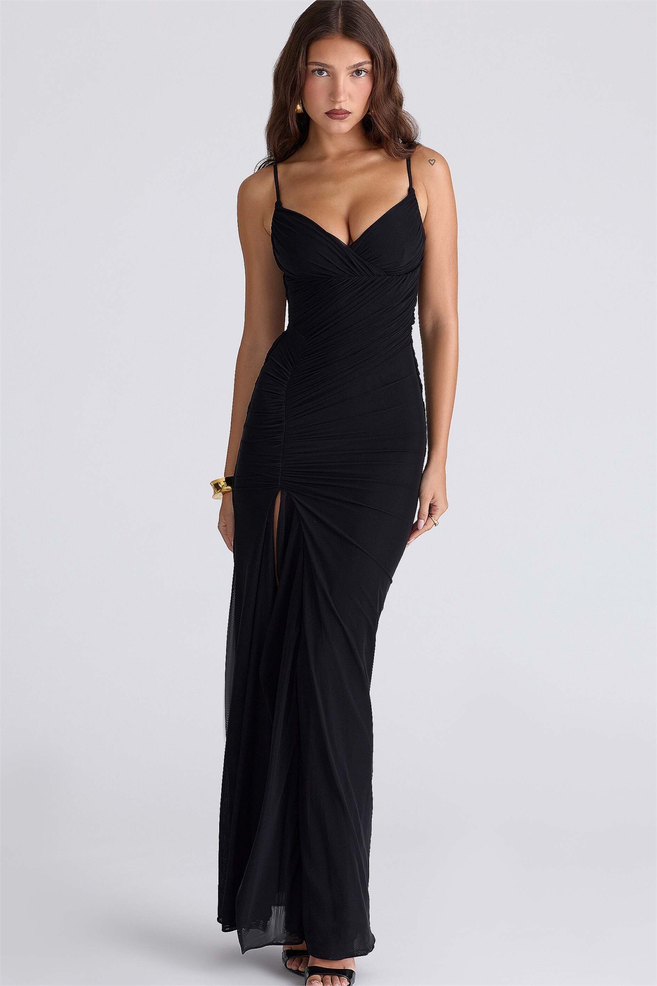 Макси-платье Issey из чёрной эластичной сетки с драпировкой