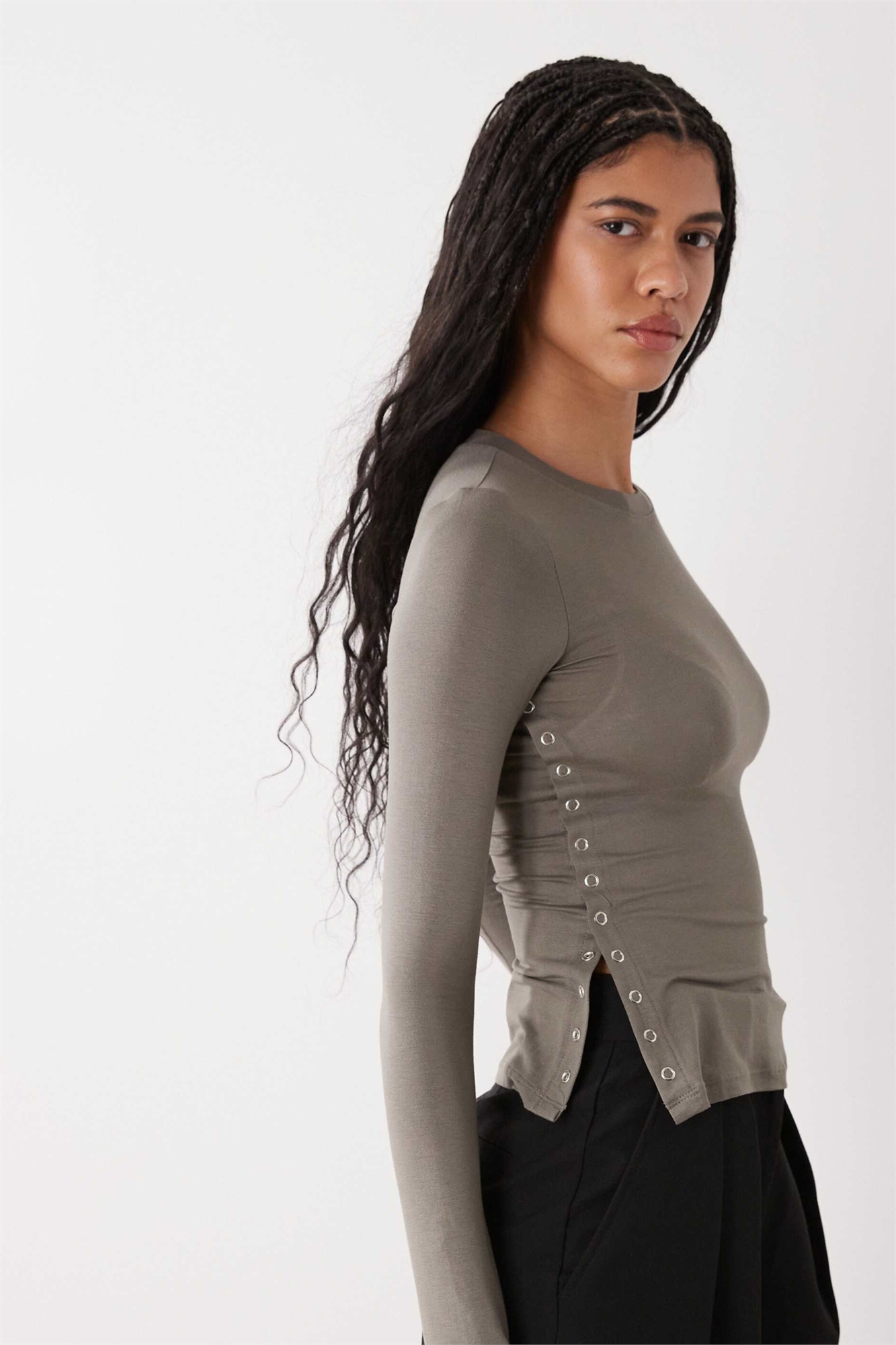 Приталенный топ с длинными рукавами, пуговицами и асимметричным подолом