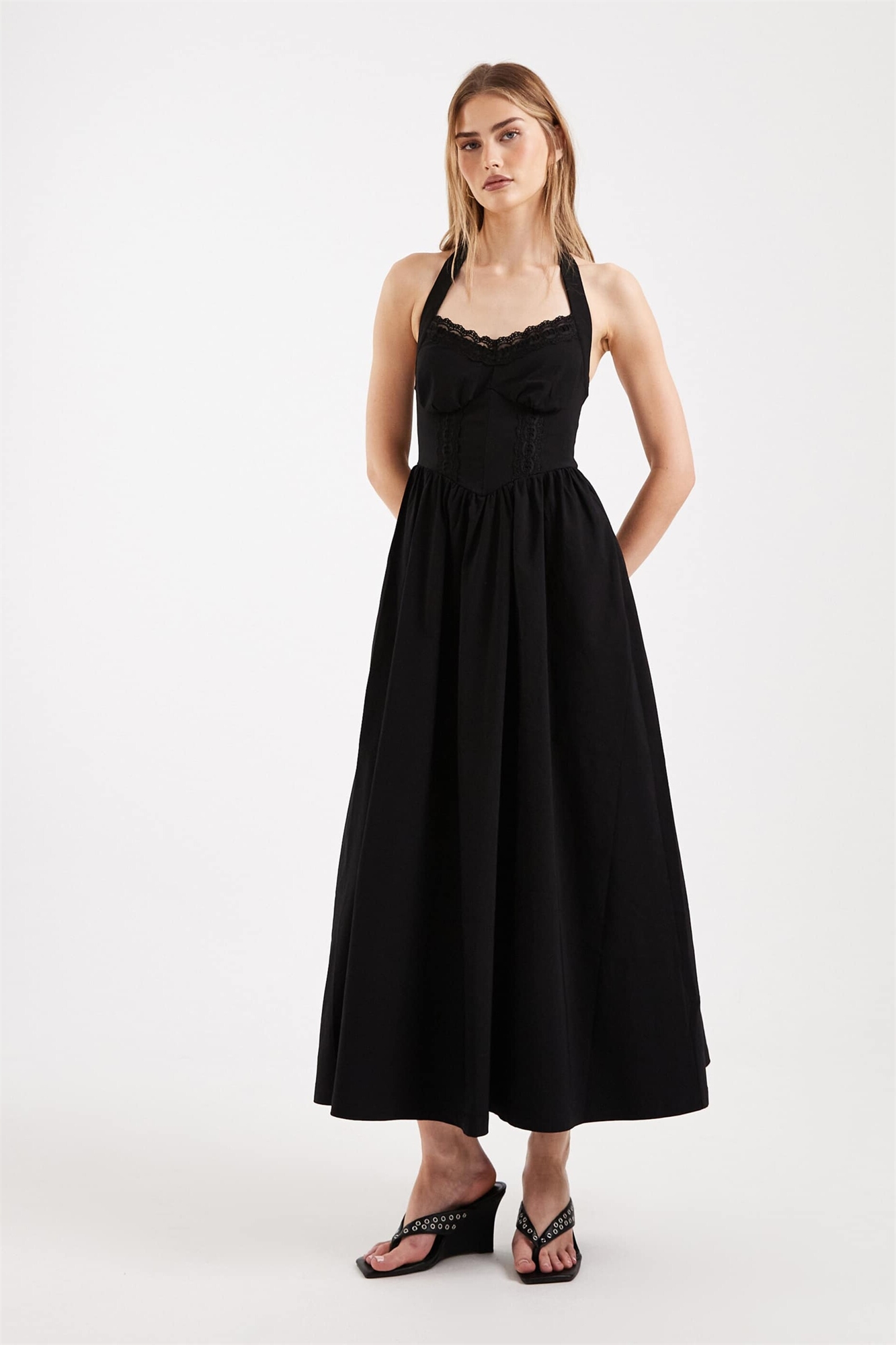 Платье-миди с завязками на шее из бенгалина с кружевной отделкой