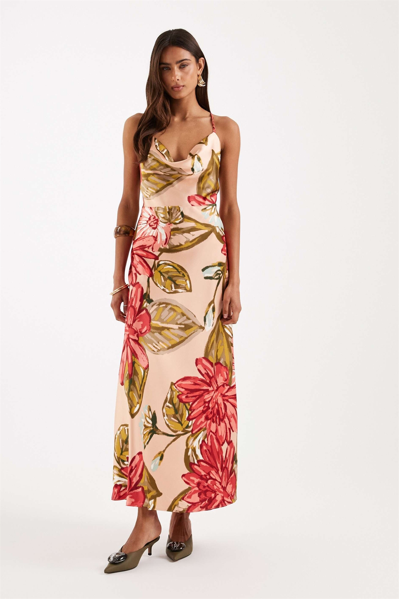 Атласное платье средней длины с воротником-капюшоном и цветочным принтом