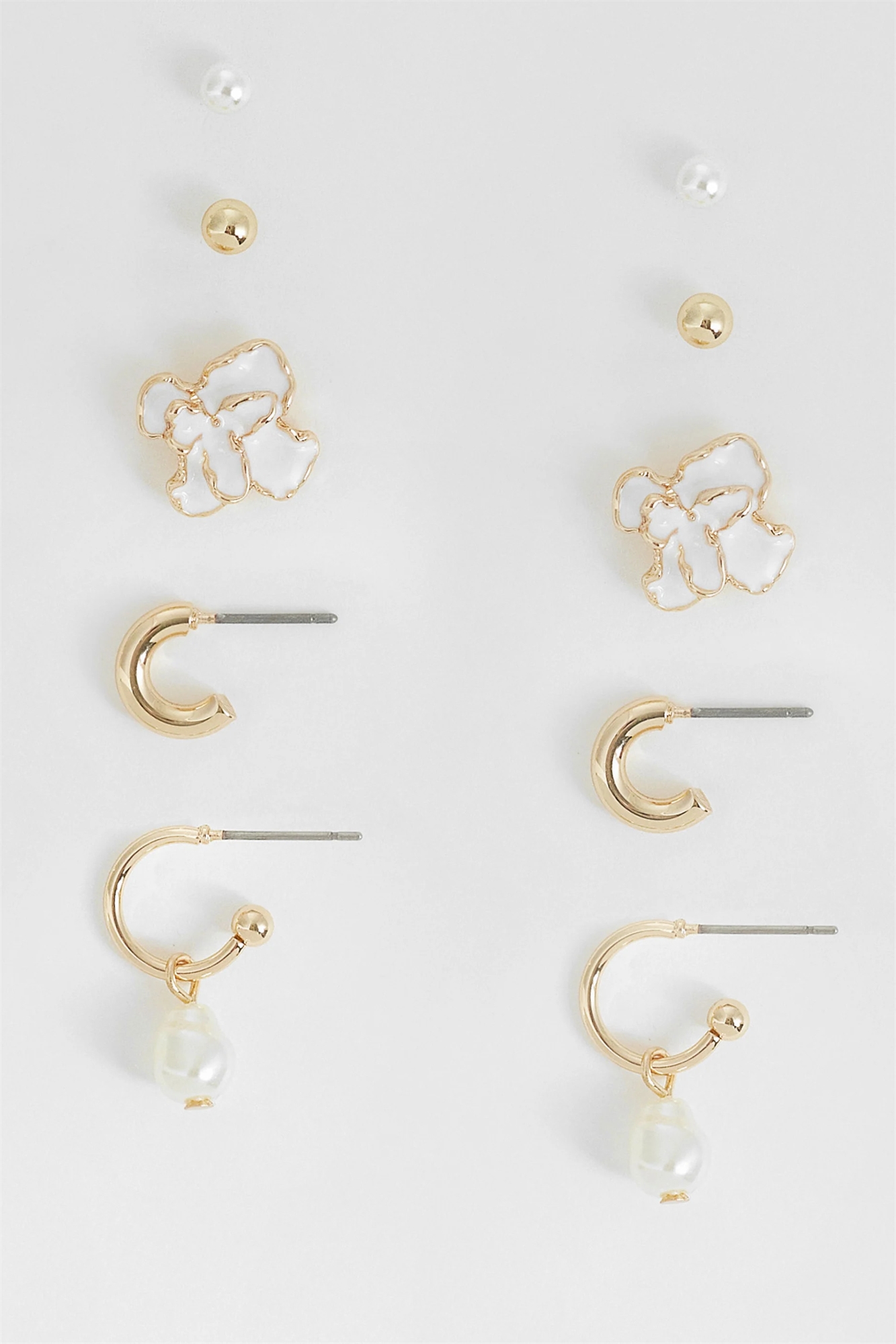 Набор сережек, состоящий из пуссет-сережек и колец с искусственными жемчужинами и элементами золотистого цвета