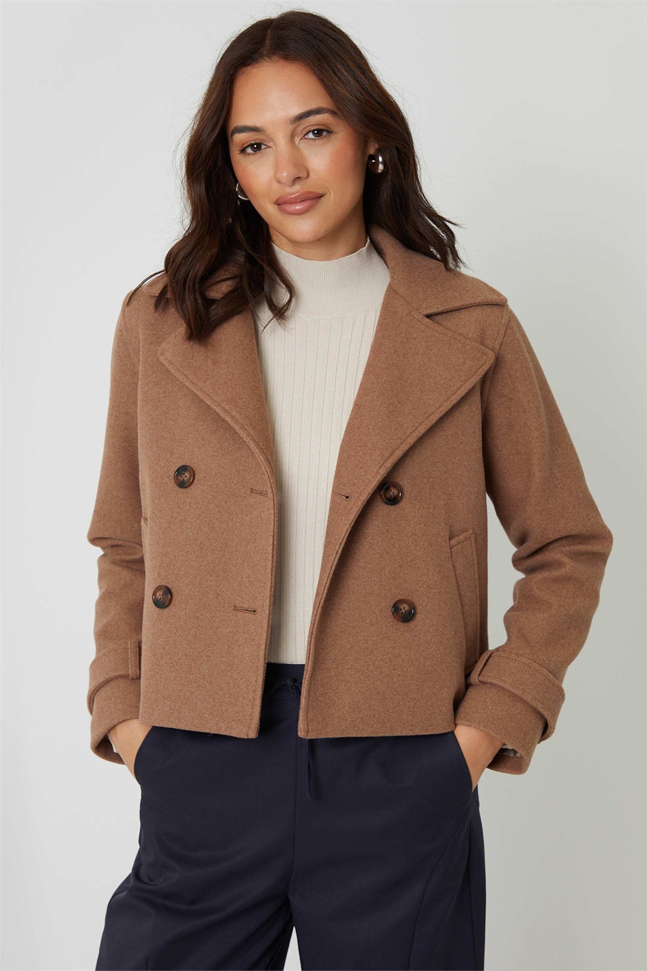 Короткий тренч из искусственной шерсти темно-коричневого цвета