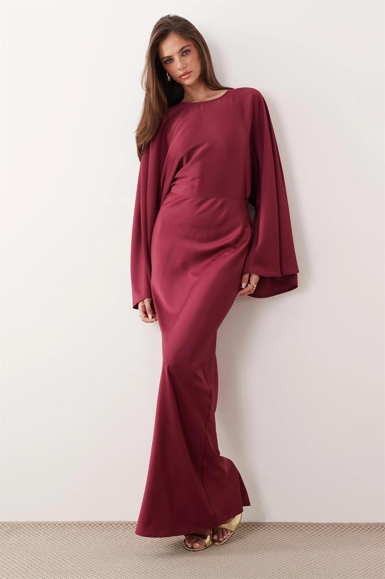 Макси-платье из фактурного атласа с рукавами «летучая мышь», косой вырез и зауженной талией