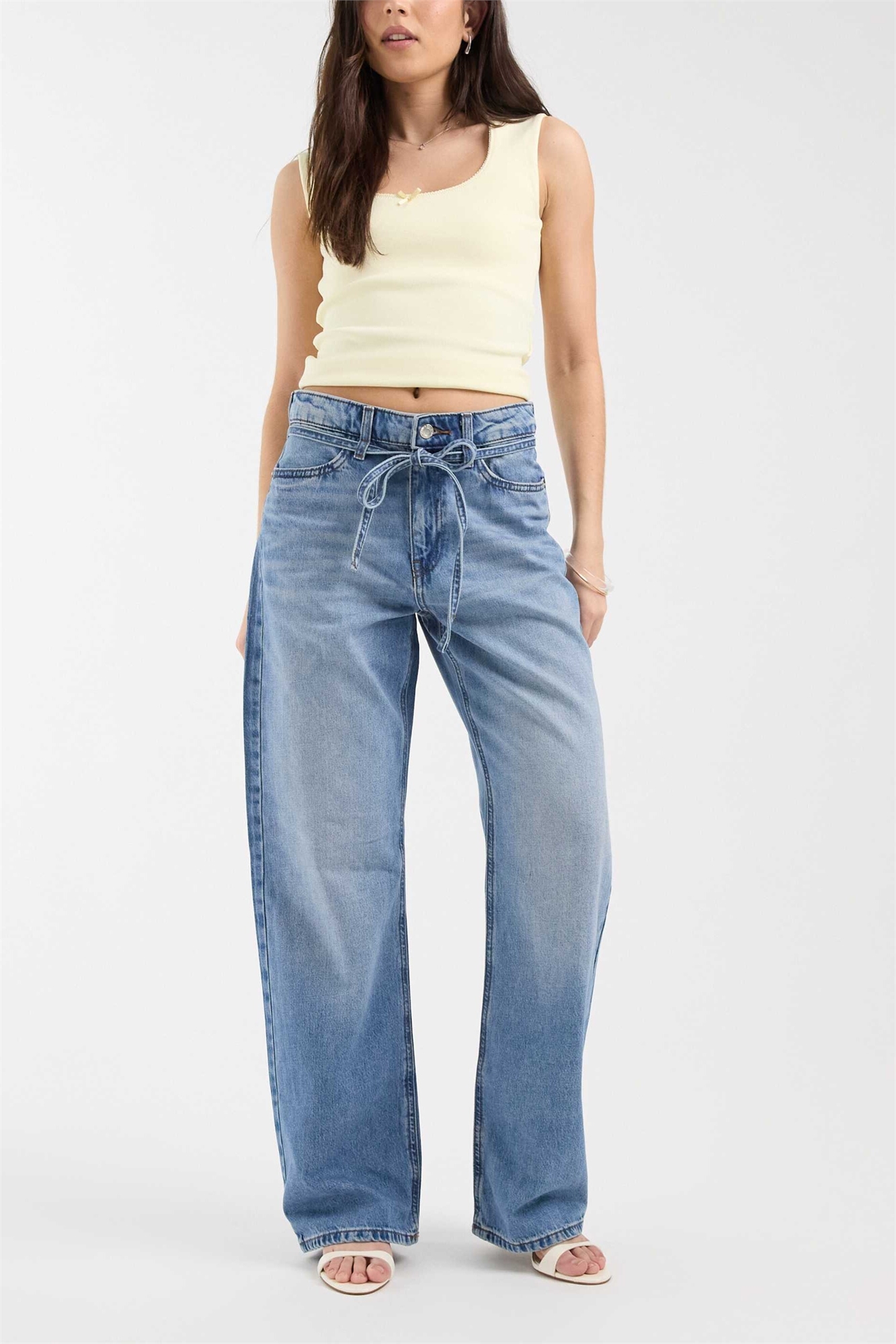 Джинсы с широкими брючинами и завязками на талии