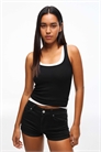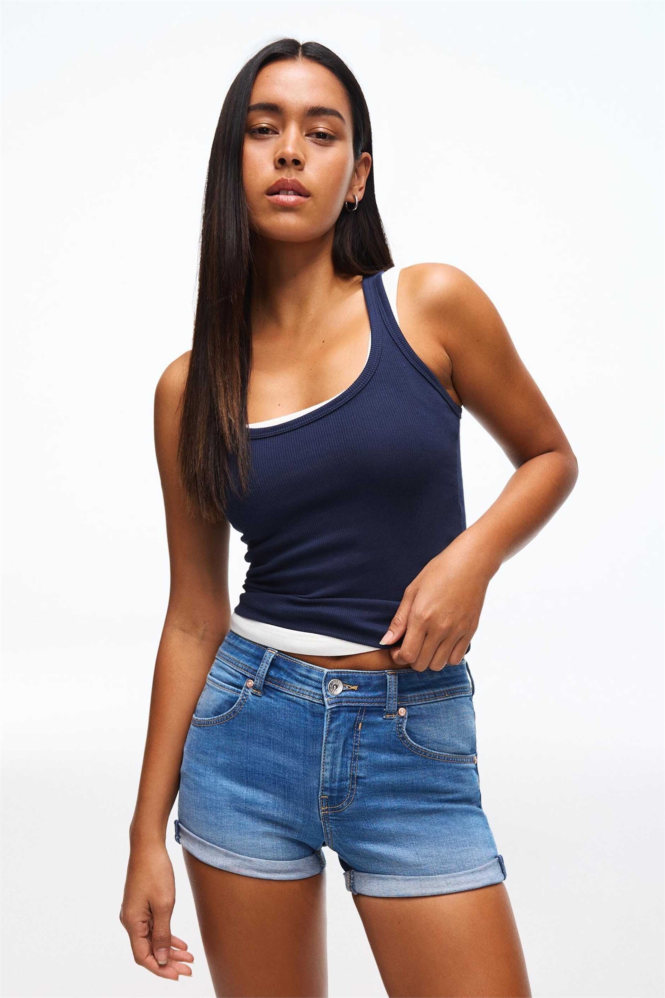 Неэластичный деним: средне-синий оттенок Основной материал: 99% хлопок, 1% эластан.