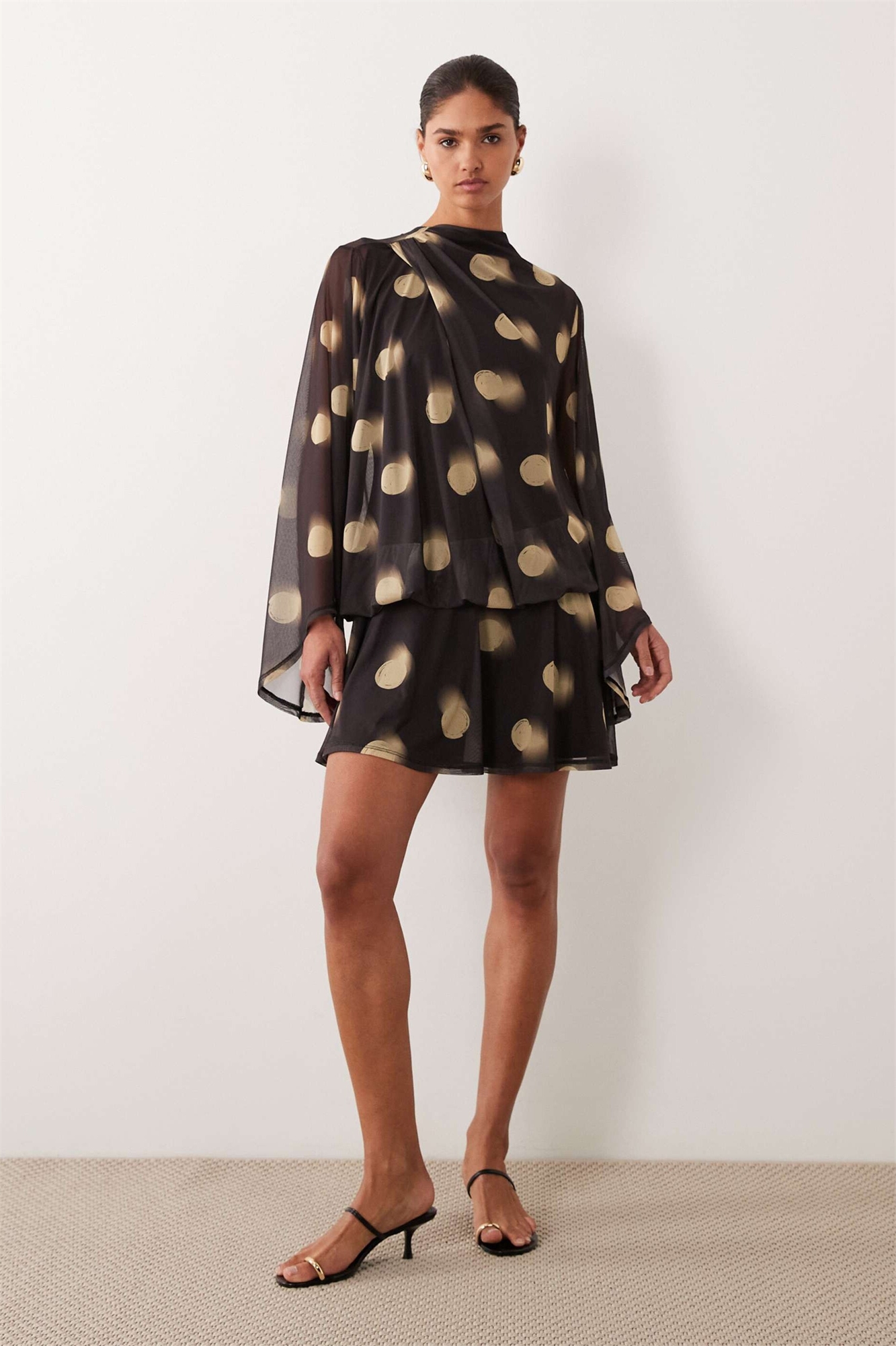 Мини-платье-блузон из ткани с принтом в виде сетки