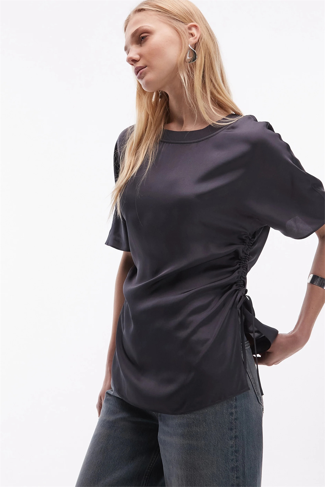 Атласная удлиненная футболка с рюшами на талии