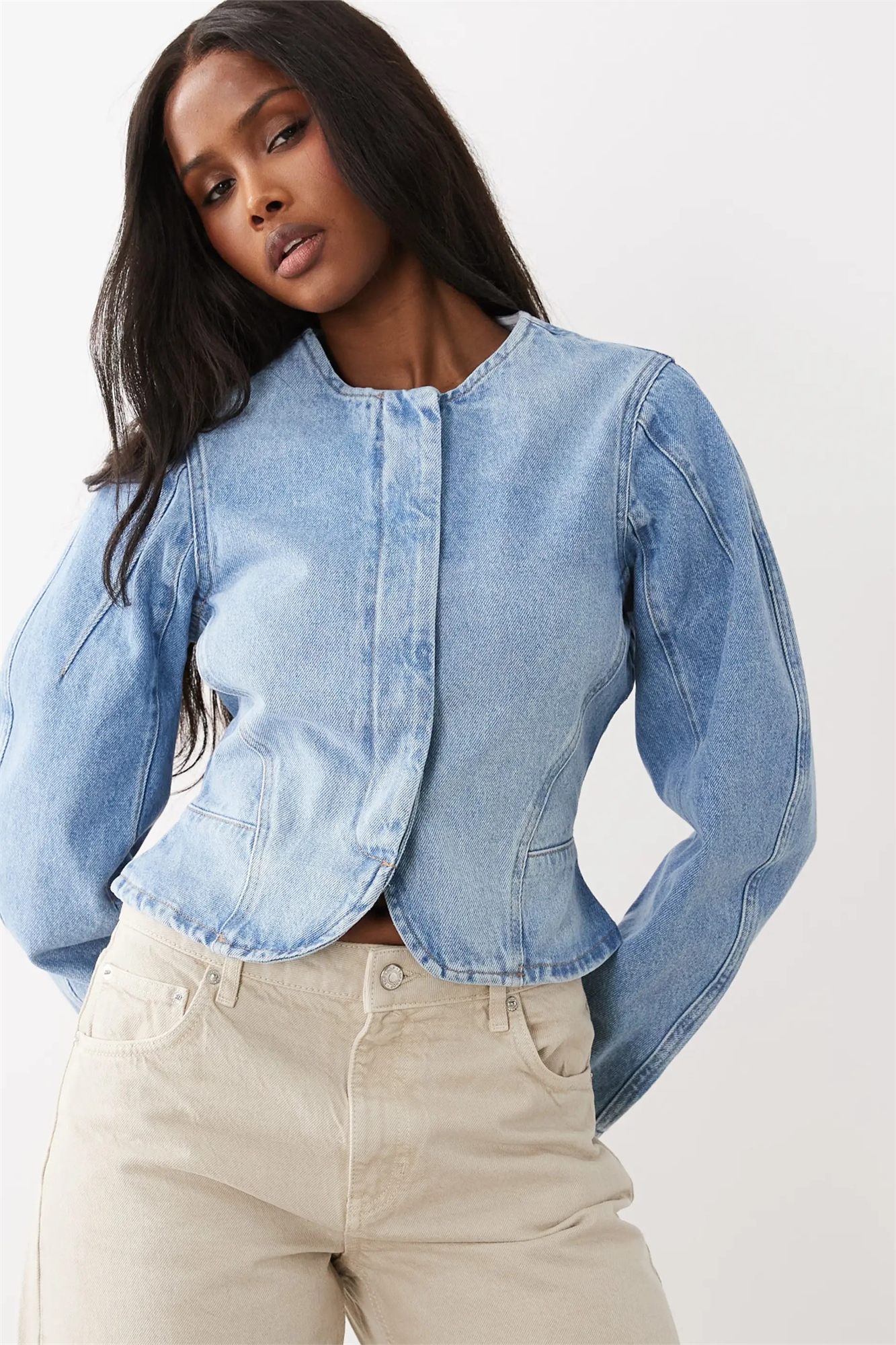 Комплект из джинсовой куртки с зауженными рукавами-бочками