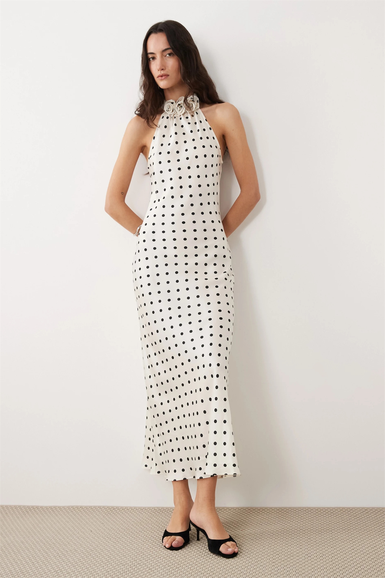 Платье-миди из атласа с цветочным принтом и завязками на шее