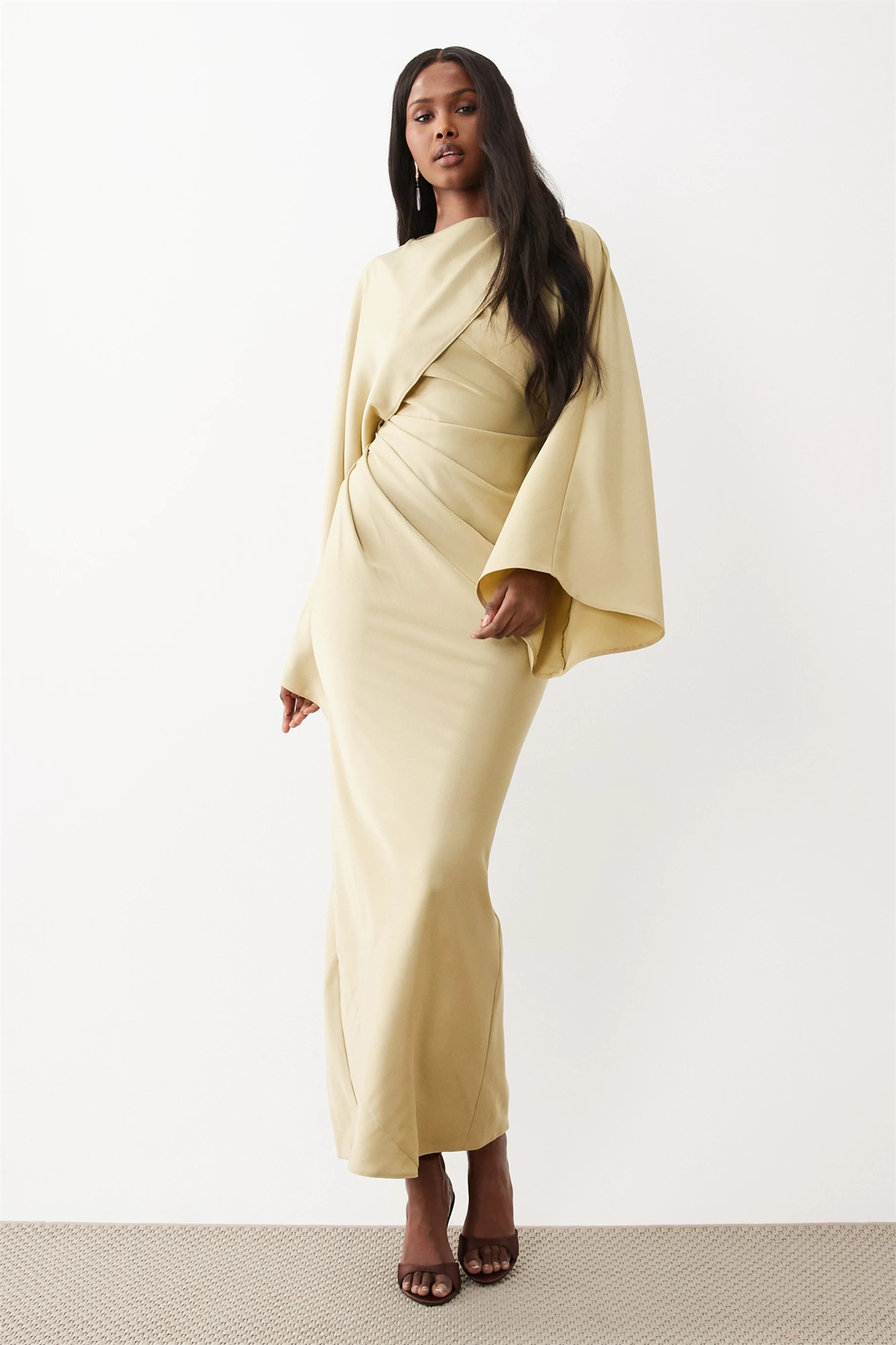 Длинное атласное платье-макси с драпировкой, длинными рукавами, перекрещивающимся вырезом спереди и высоким воротником