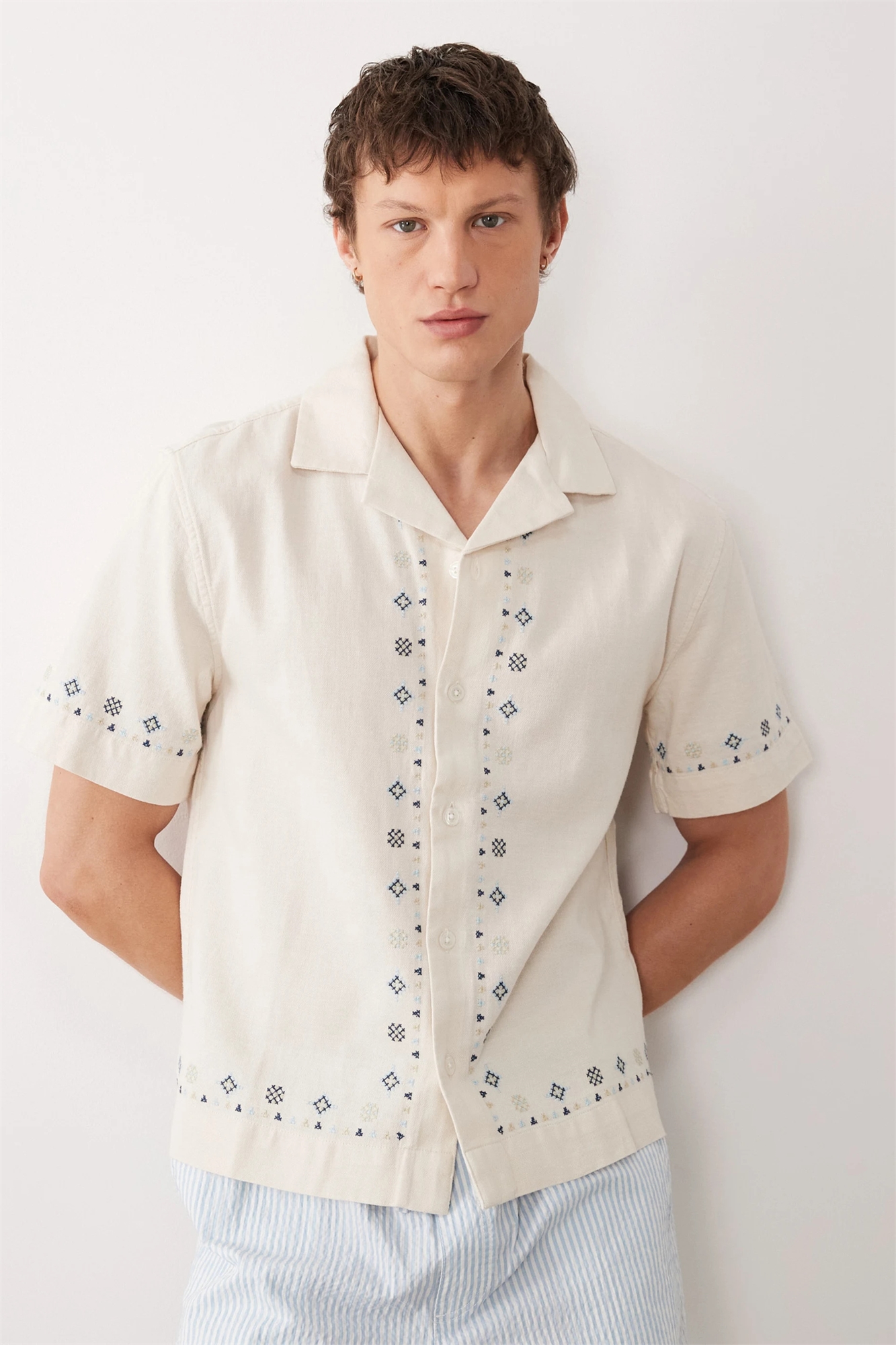 Рубашка с короткими рукавами из смеси хлопка и льна с вышитым узором